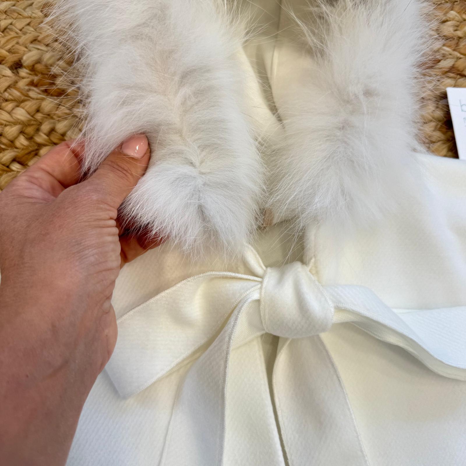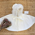 Raffinata mantella da battesimo per bimba, perfetta per la stagione autunno-inverno. Con cappuccio bordato in morbida eco-pelliccia e chiusura con elegante fiocco centrale, completa con stile e calore l’abito da cerimonia. Un capo speciale per il giorno del battesimo.