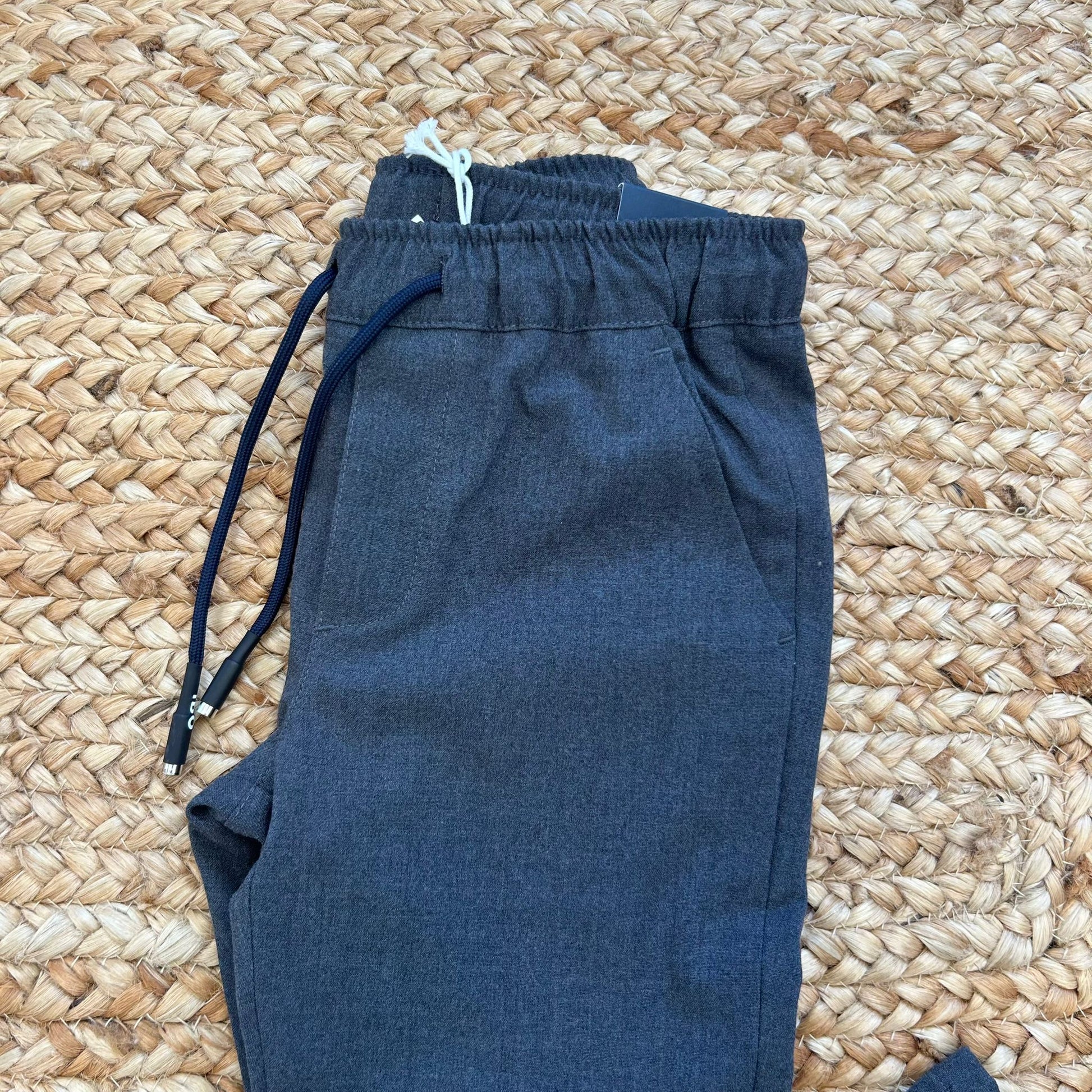 Pantalone bimbo color grigio antracite con elastico in vita e laccetto regolabile blu. Morbido e confortevole, perfetto per la scuola e il tempo libero. Il taglio pulito e moderno lo rende adatto anche a look più curati, per uno stile casual ed elegante allo stesso tempo.