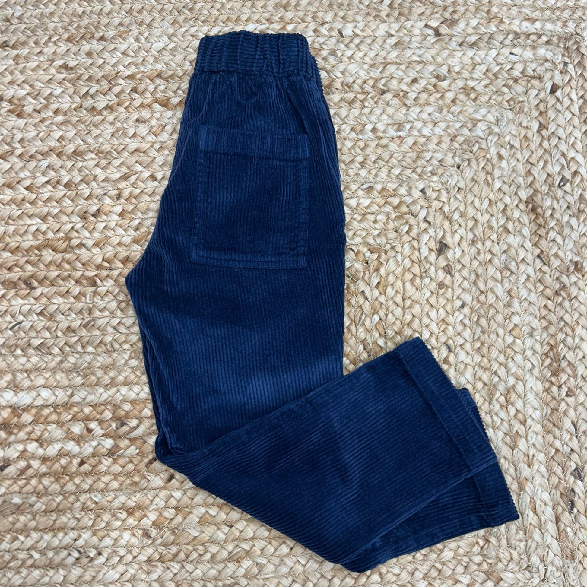 Pantalone bimbo in velluto blu, con elastico in vita e laccetto regolabile tono su tono. Caldo, morbido e versatile, ideale per la stagione fredda. Perfetto per la scuola o per un look più curato, unisce comfort e stile in un capo pratico e raffinato.