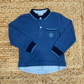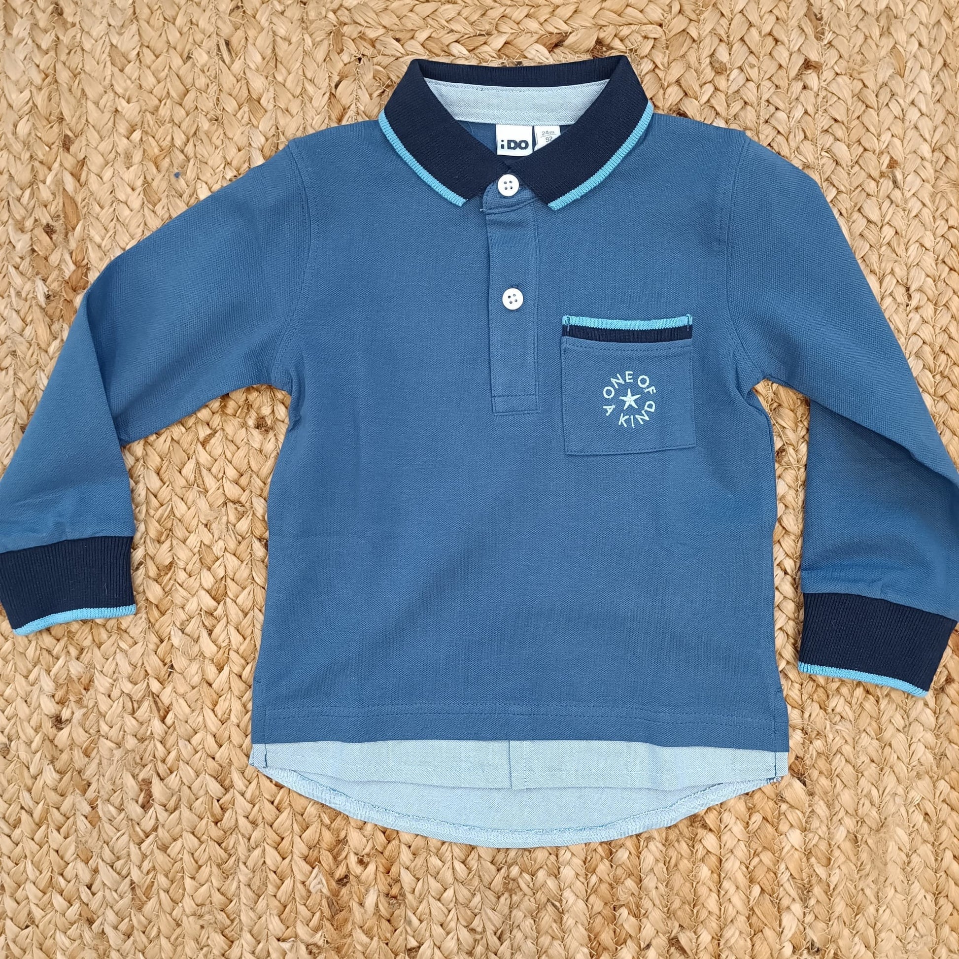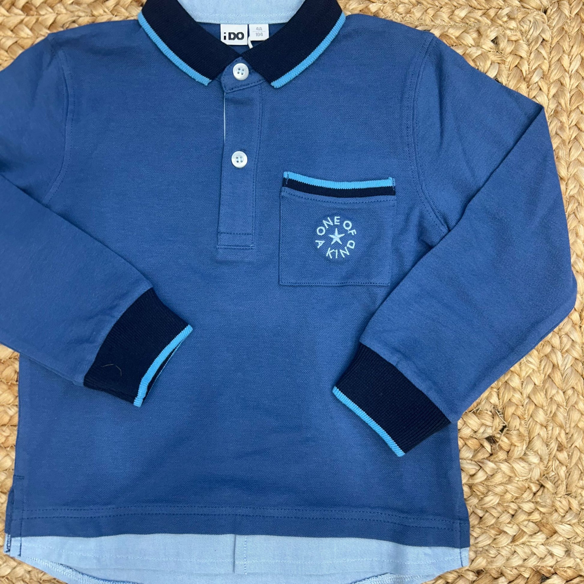 Polo a maniche lunghe bluette con colletto e polsini blu navy a contrasto. Taschino frontale con scritta “One of a kind”. Comoda e moderna, perfetta per look casual e curati.
