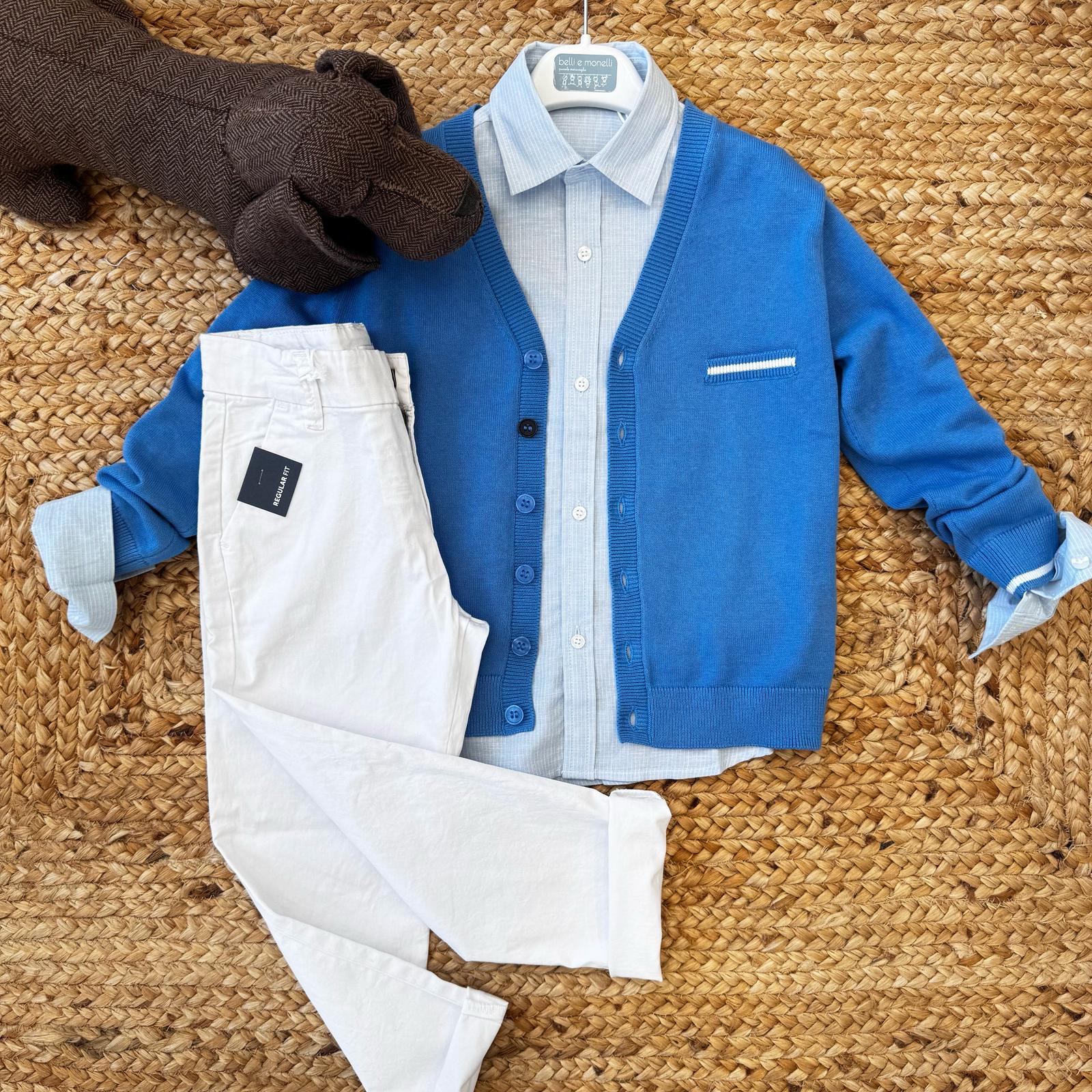CARDIGAN AZZURRO ROYAL, CAMICIA A RIGHE E PANTALONE BIANCO BAMBINO