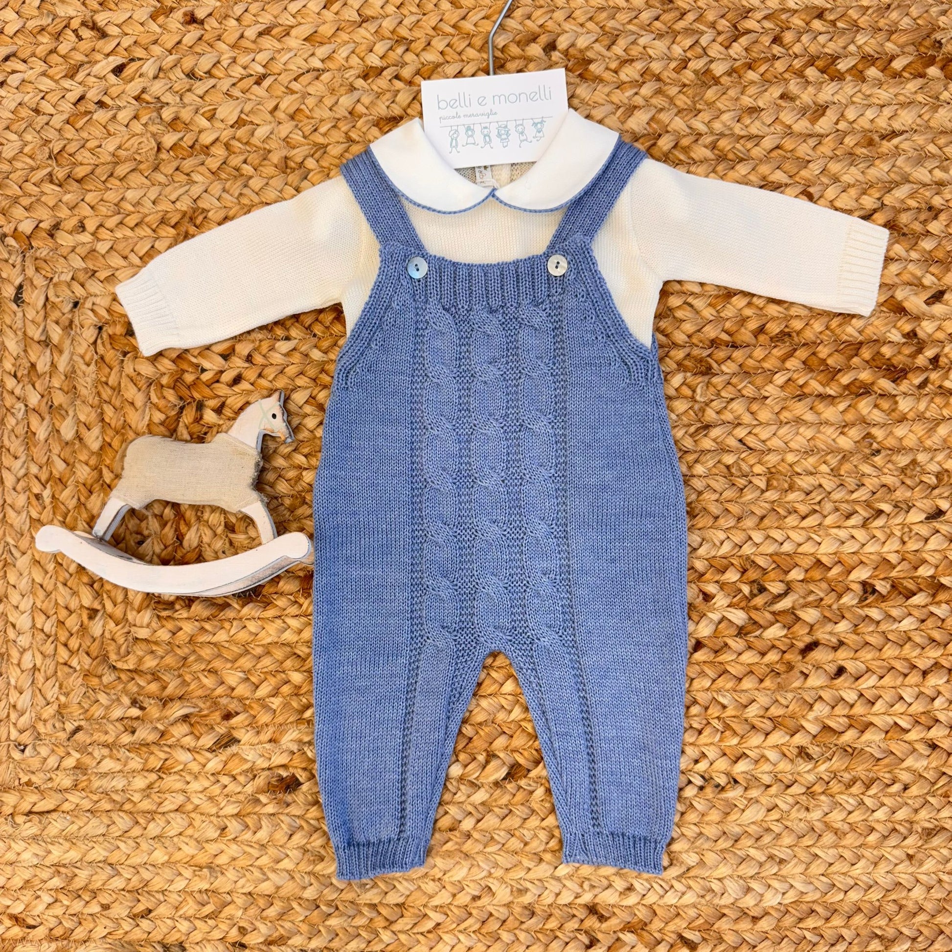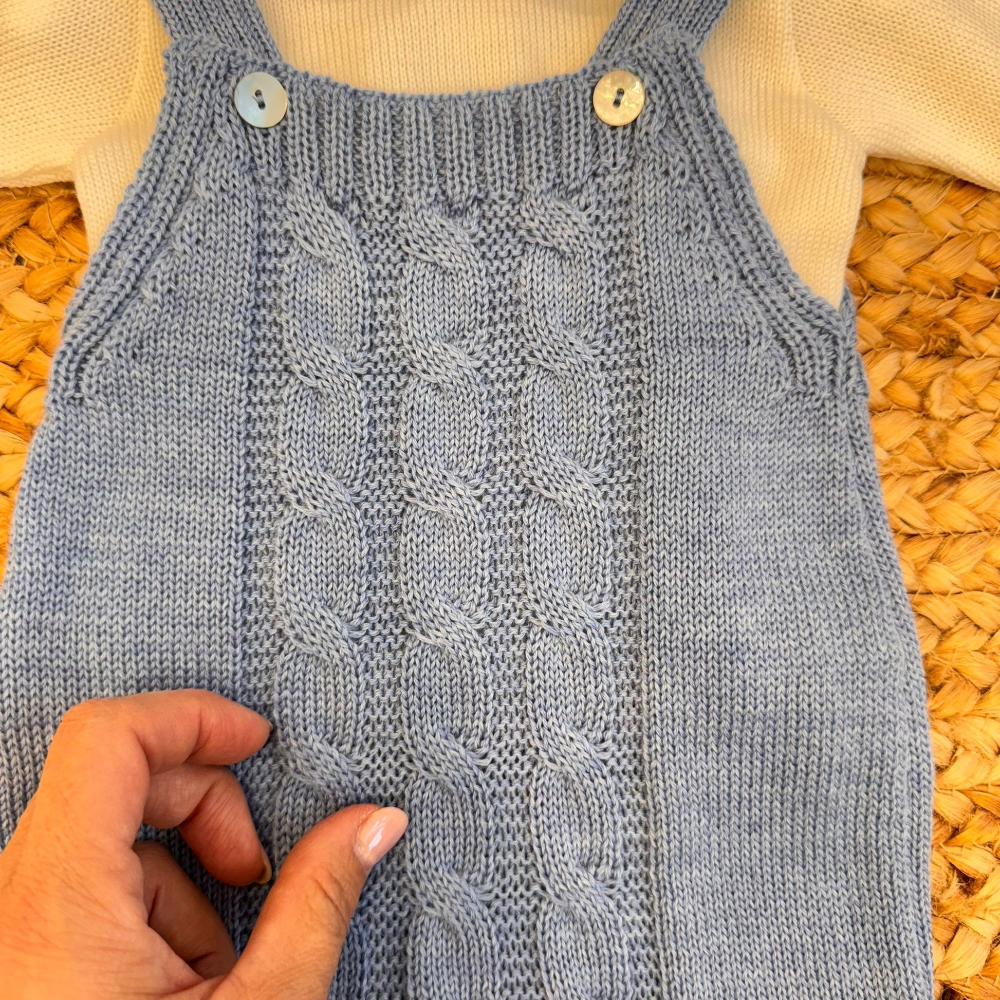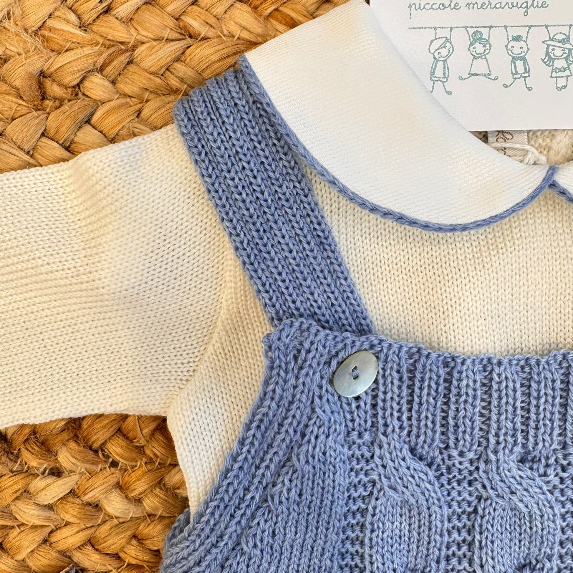 Delicata salopette per neonato realizzata in 100% pura lana, perfetta per le mamme che cercano qualità e comfort per l'uscita clinica o il set nascita. Il capo, nel raffinato colore azzurro polvere, è impreziosito da una lavorazione a treccia centrale sul davanti che conferisce un tocco sartoriale ed elegante. Completato da spalline con bottoni madreperlati e da una maglia interna color panna con colletto profilato in tinta.