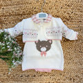 Un completo che fa battere il cuore. La salopette in lana panna con orsetta ricamata e fiocchetto rosa si indossa sopra una morbida maglia a manica lunga con colletto vichy. Il gilet aperto con cuoricini in jacquard e bordino rosa aggiunge un tocco romantico e protegge dal freddo con delicatezza. Perfetto per i primi giorni, per un'uscita speciale o per sentirla sempre elegante e comoda.