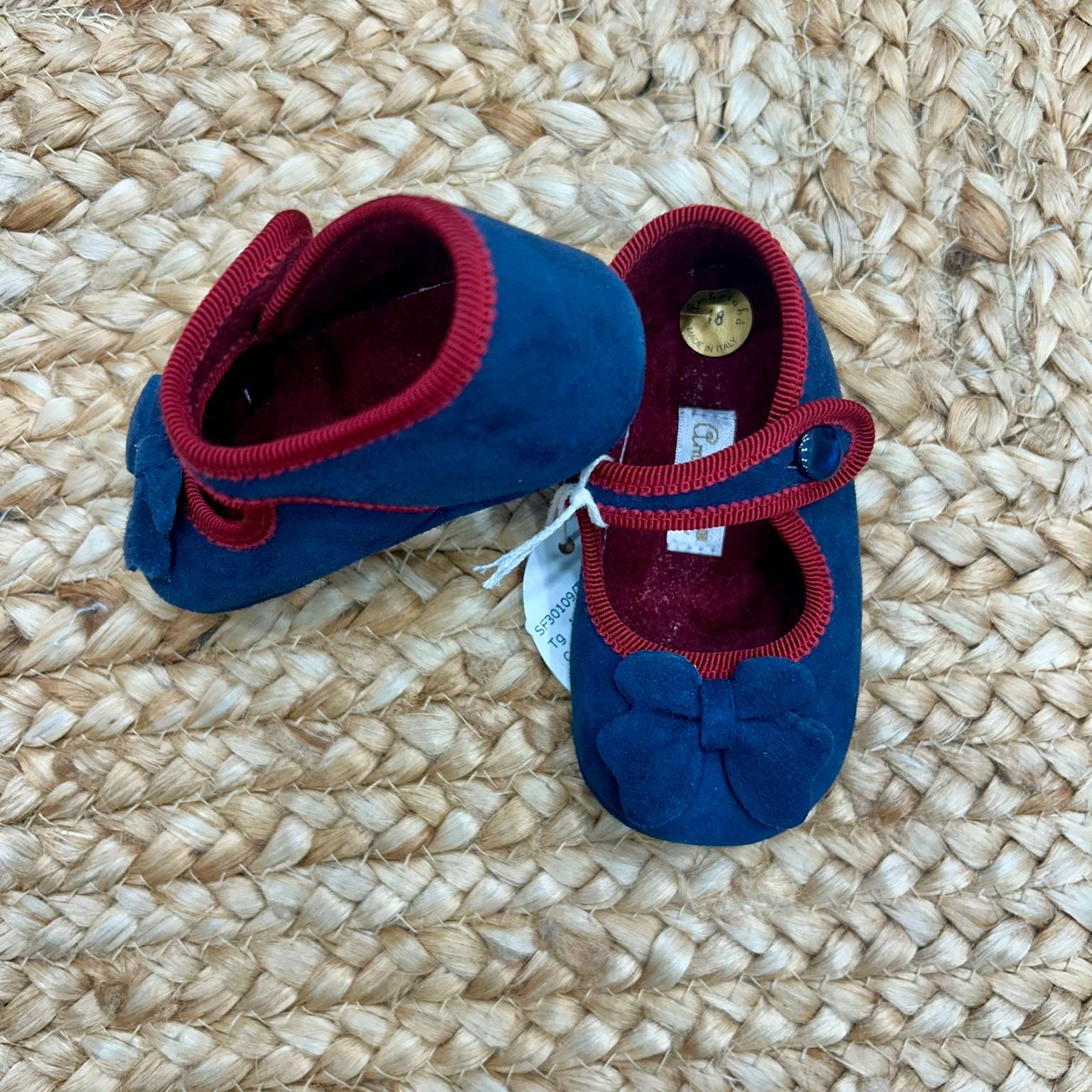Un contrasto morbido e raffinato che racconta subito eleganza: queste scarpine da culla in velour blu, illuminate dai profili rosso scuro e dal fiocco tono su tono, accompagnano la tua bimba nei suoi primi momenti con un tocco di dolcezza e stile.