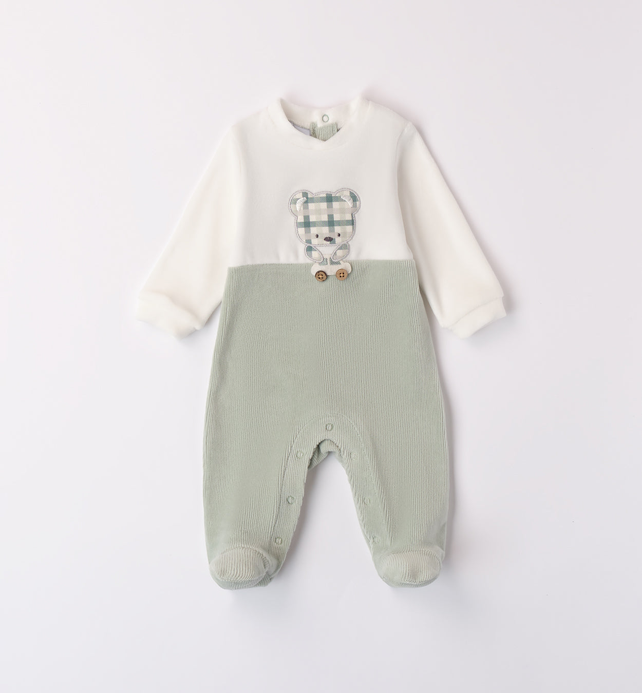 Tutina bianca e verde salvia per neonato con ricamo orsetto