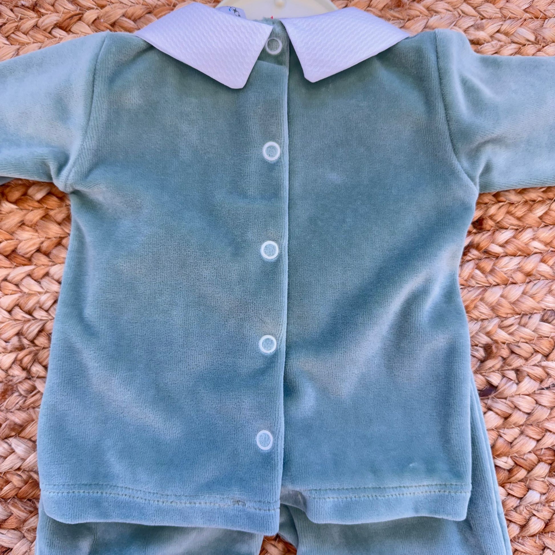 Raffinata tutina per neonata in morbida ciniglia verde salvia, impreziosita da delicati fiocchi ricamati a mano sul petto e sul colletto bianco in contrasto. Apertura posteriore con bottoncini a pressione per una vestibilità comoda e pratica. Un capo elegante e avvolgente, perfetto come completino nascita o idea regalo di pregio.