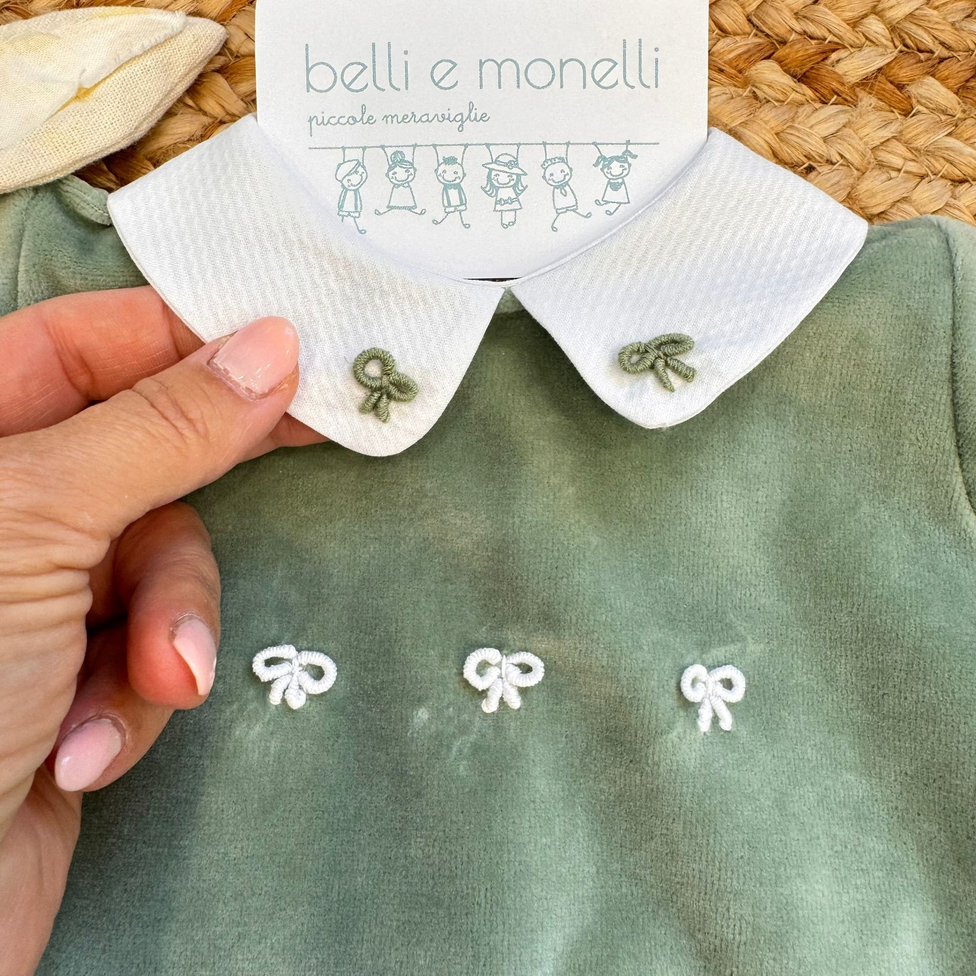 Tutina ciniglia verde salvia neonata con fiocchi ricamati