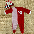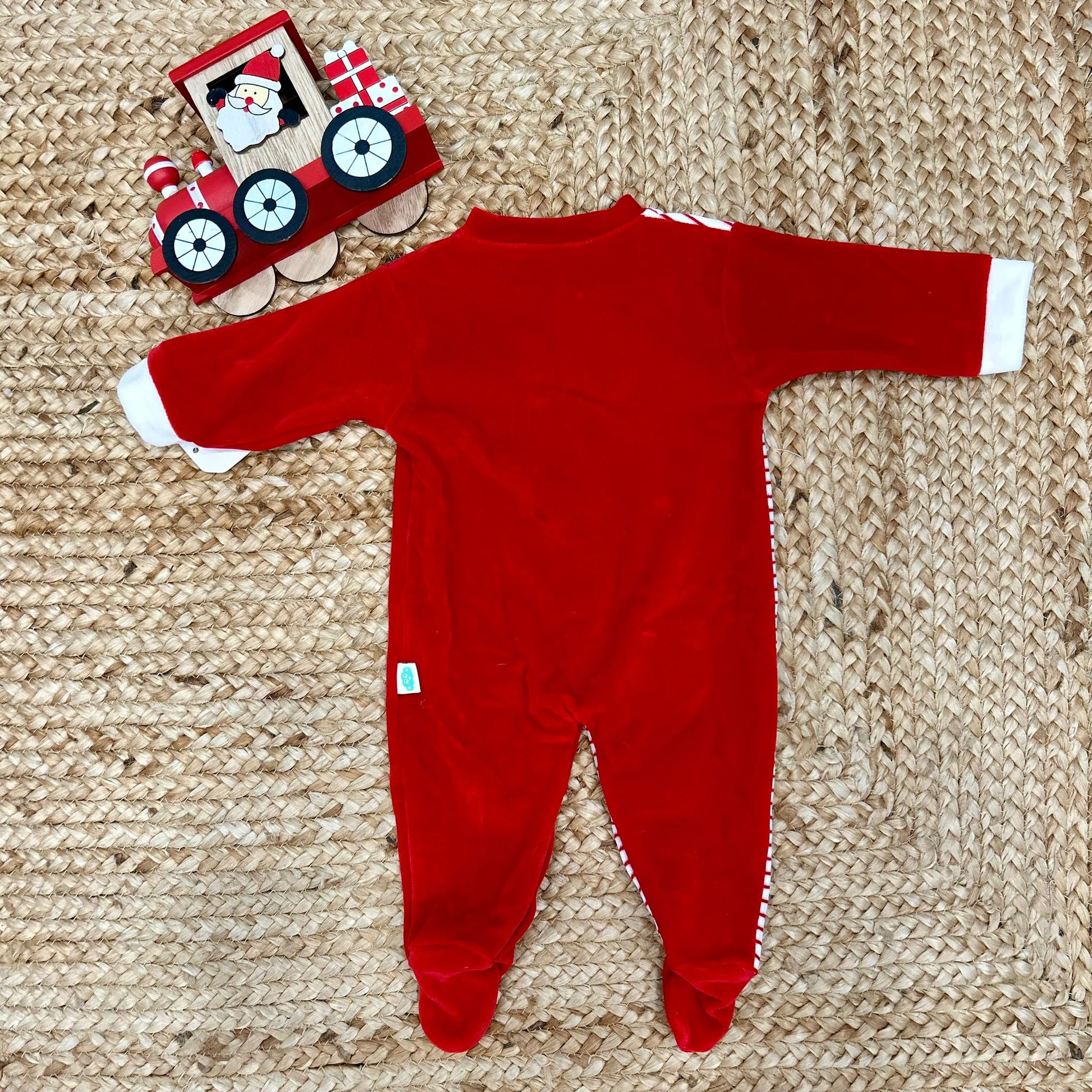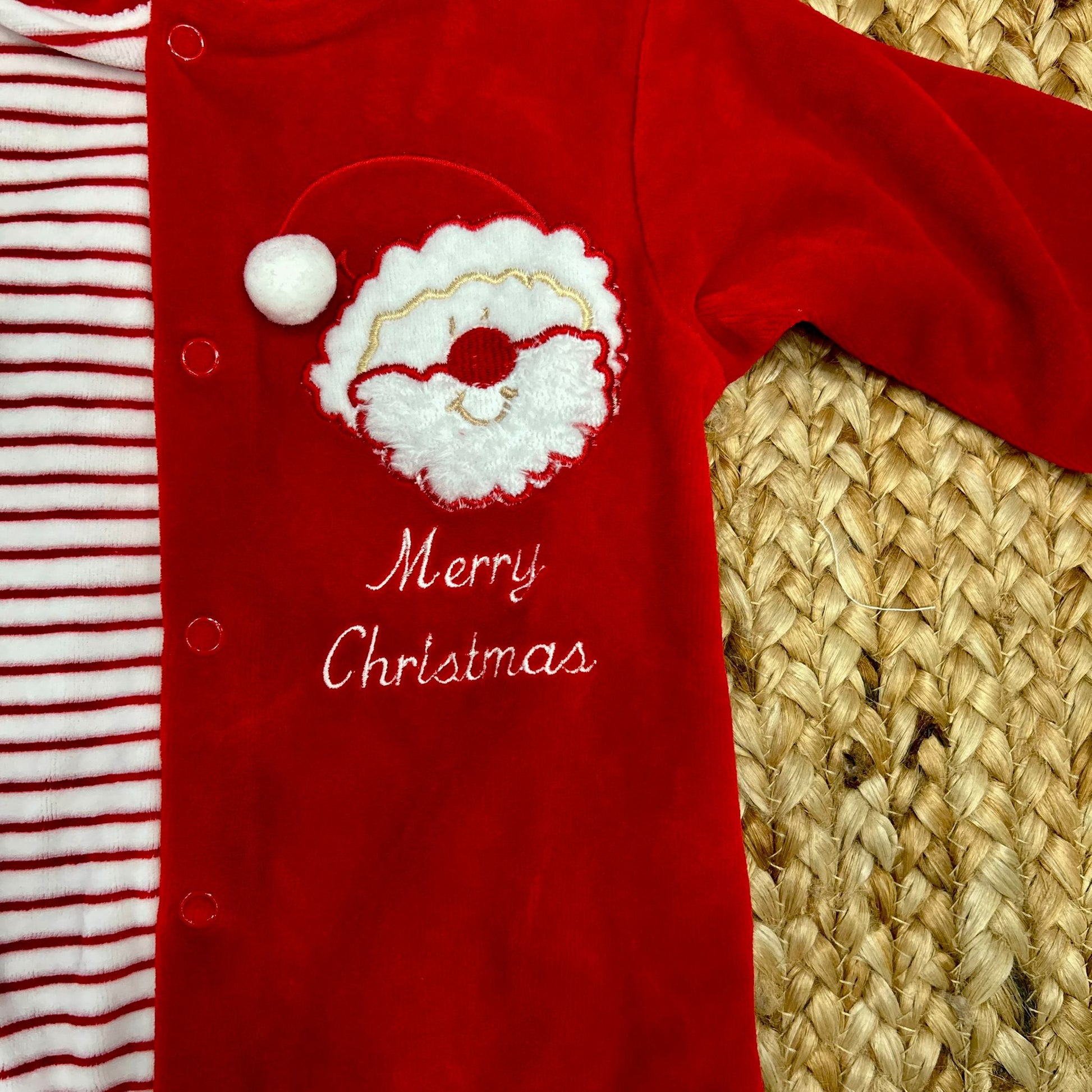 Morbida tutina natalizia in ciniglia rossa con ricamo di Babbo Natale e scritta “Merry Christmas”. Il modello presenta una comoda apertura con bottoncini frontali e piedini chiusi, ideale per tenere il bimbo caldo e comodo durante le feste. Il dettaglio a righe bianche e rosse dona un tocco allegro e perfetto per il primo Natale del tuo piccolo.