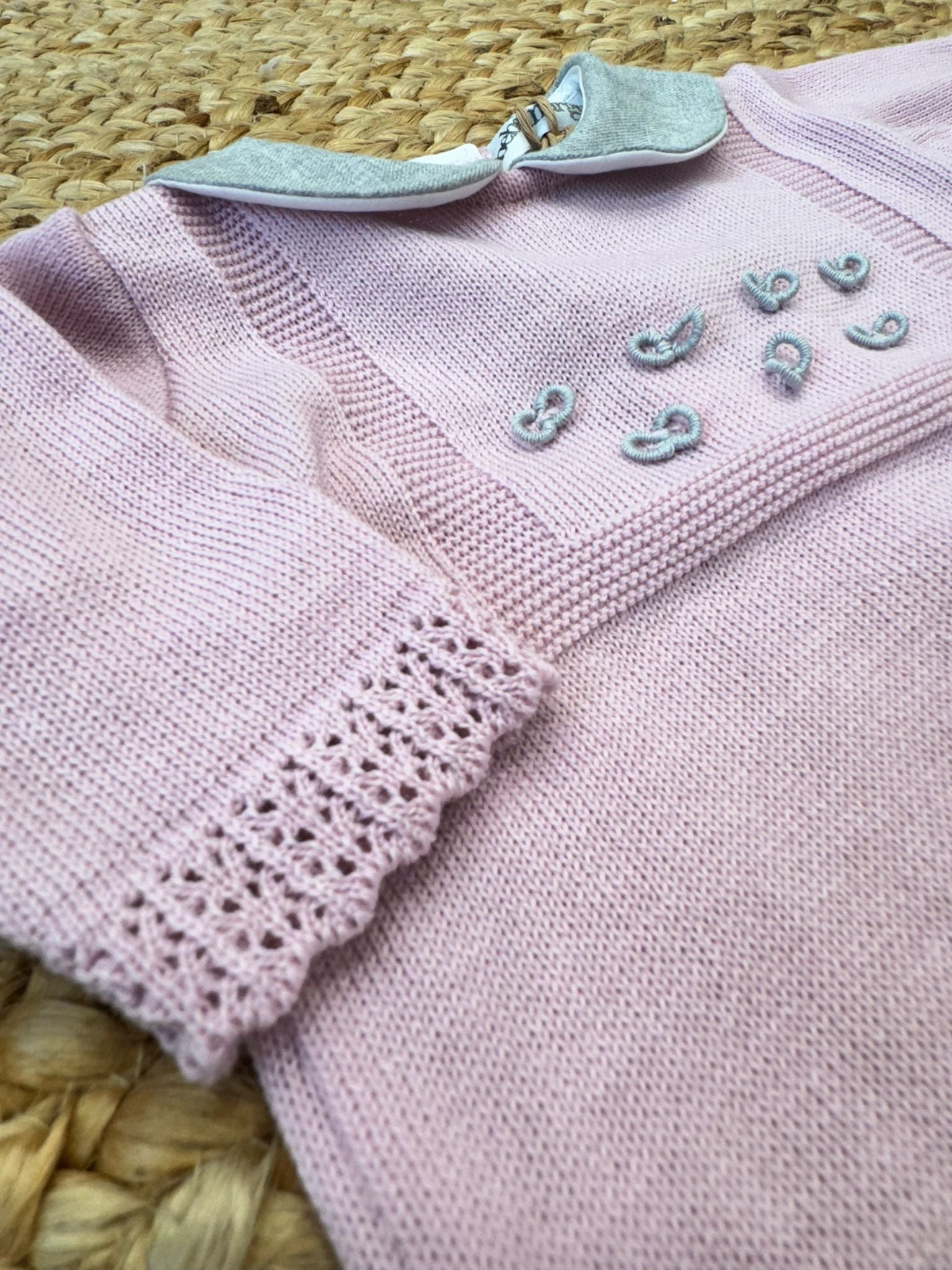 Elegante tutina per neonata in tonalità glicine, realizzata in misto 50% lana e 50% acrilico, ideale per corredini nascita e occasioni speciali.