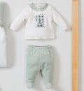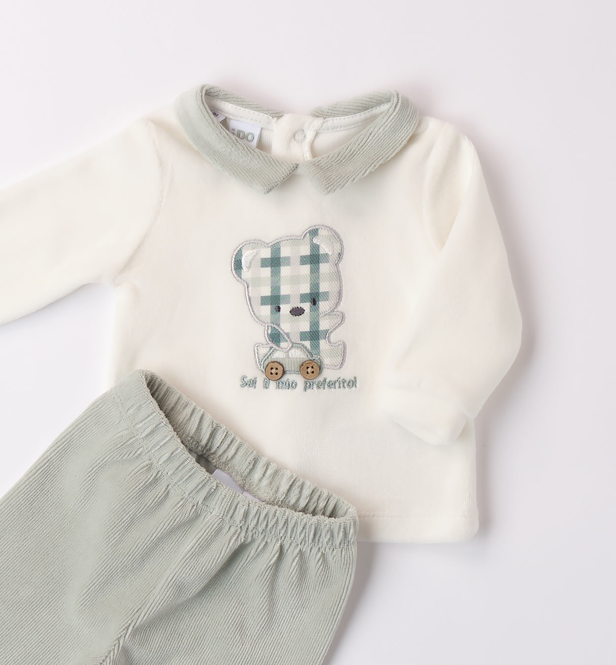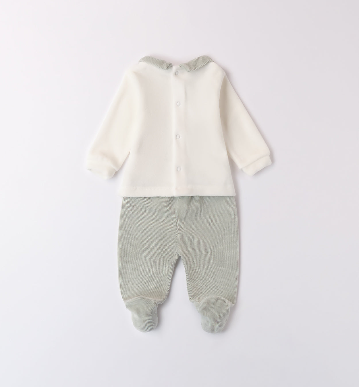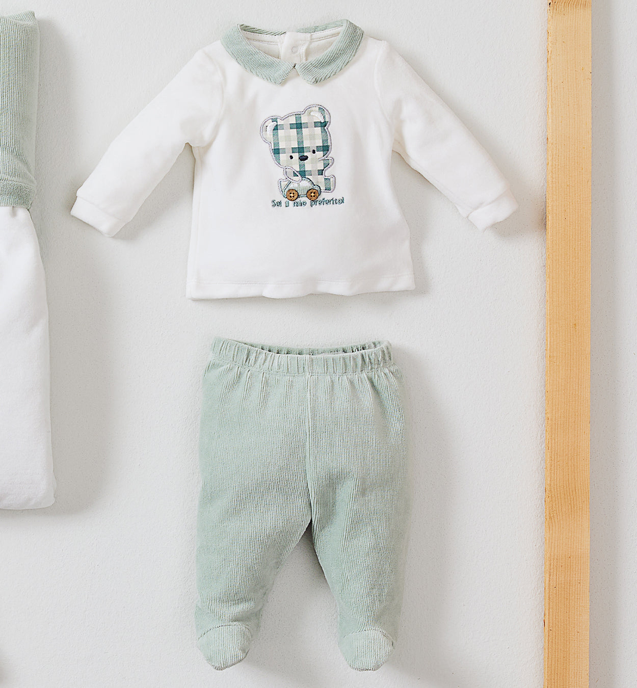 Tutina neonato in caldo cotone, completa di maglia e pantalone coordinati. La maglia panna è arricchita da un dolce orsetto scozzese con bottoncini applicati e colletto verde in velluto millerighe. I pantaloni verde tenue con piedini garantiscono comfort e morbidezza. Perfetta per corredino, set nascita e uscita clinica. Che ci crediate o no, i vostri bambini cambieranno il mondo.