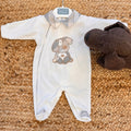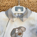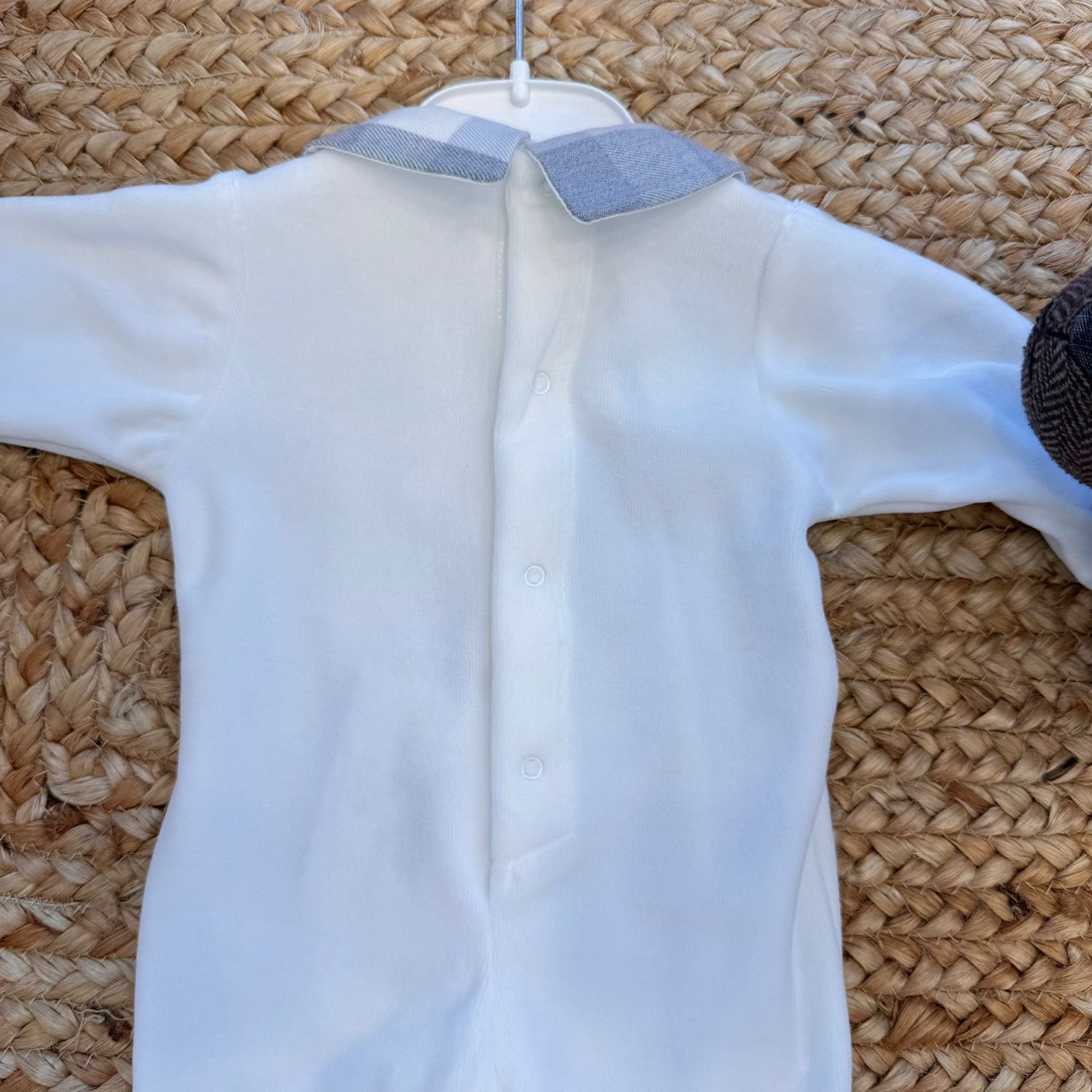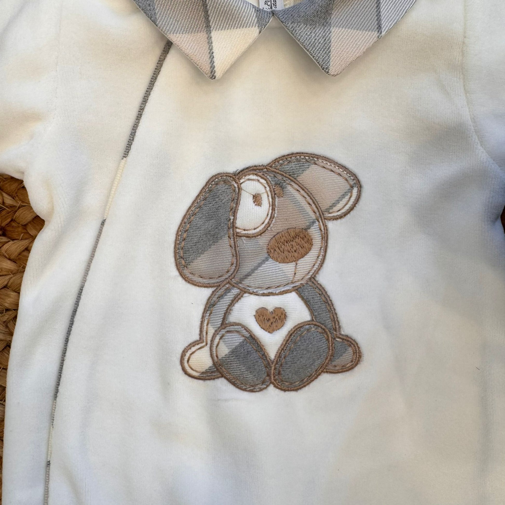 Morbida tutina in ciniglia panna con dettagli grigio perla, pensata per il comfort e l’eleganza del neonato. Colletto in tessuto scozzese, dolce applicazione cagnolino centrale e piedini chiusi. Chiusura posteriore con bottoncini a pressione per una vestizione pratica. Perfetta per corredino e set nascita. Che ci crediate o no, i vostri bambini cambieranno il mondo.