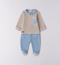 Completo due pezzi in morbida ciniglia, composto da maglia color beige con colletto azzurro e ricamo orsetto con taschina, abbinata a pantalone azzurro con piedini e dolce ricamo orsetto sul retro. Un coordinato caldo, pratico e raffinato, ideale per i primi mesi, perfetto come set nascita o regalo per baby shower. Apertura con bottoncini a pressione sul retro per la massima comodità.