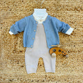 Tutina tre pezzi neonato in cotone e lana azzurro e beige