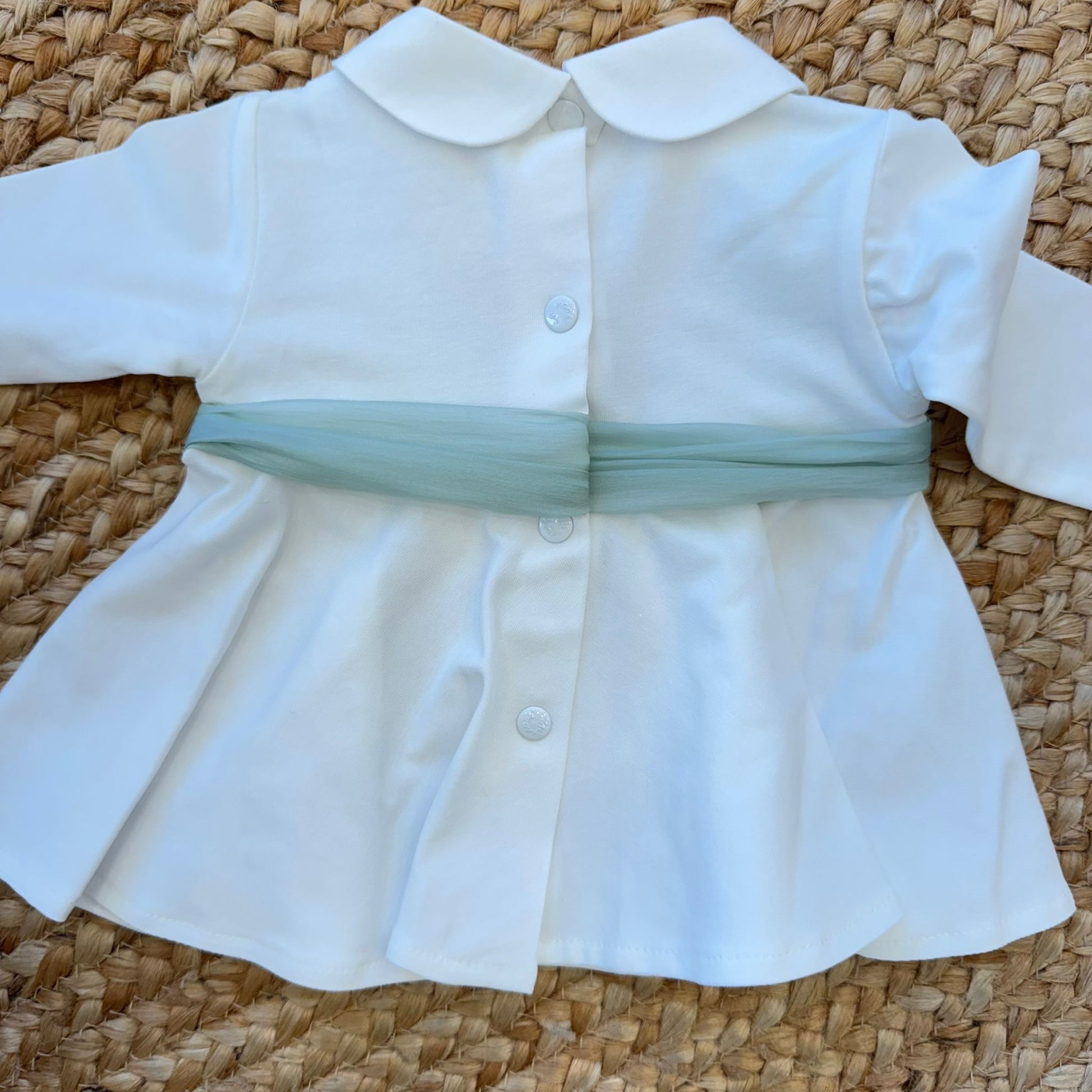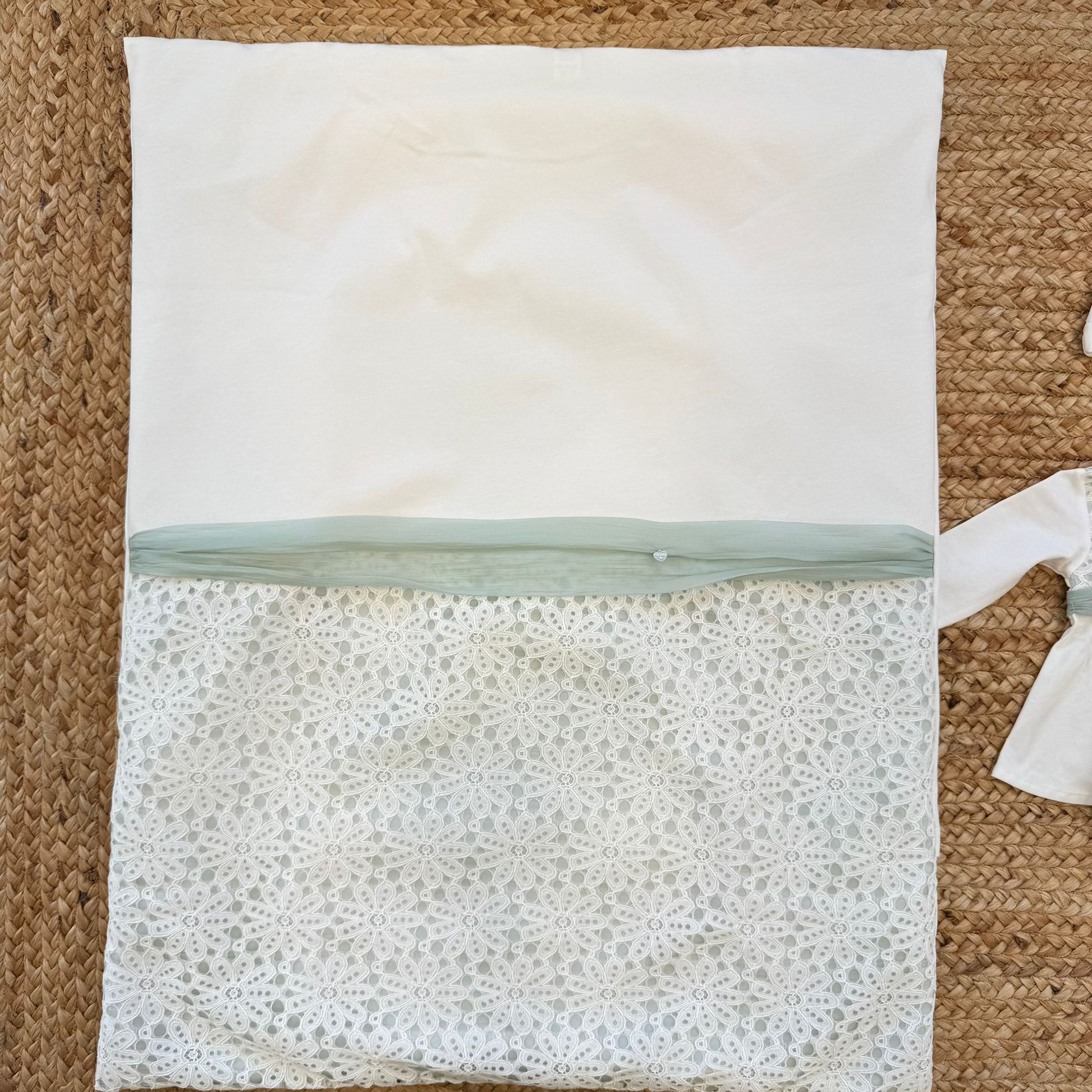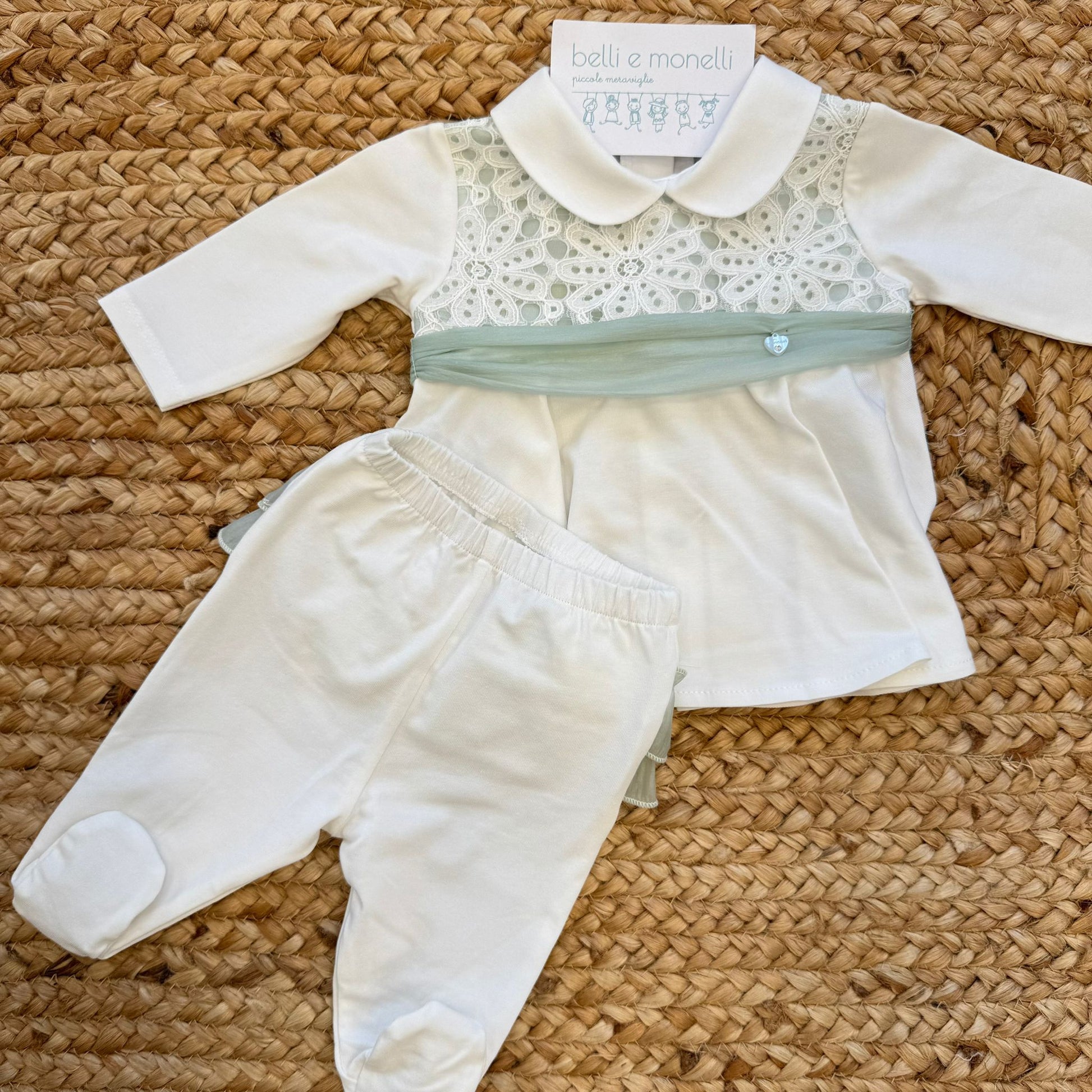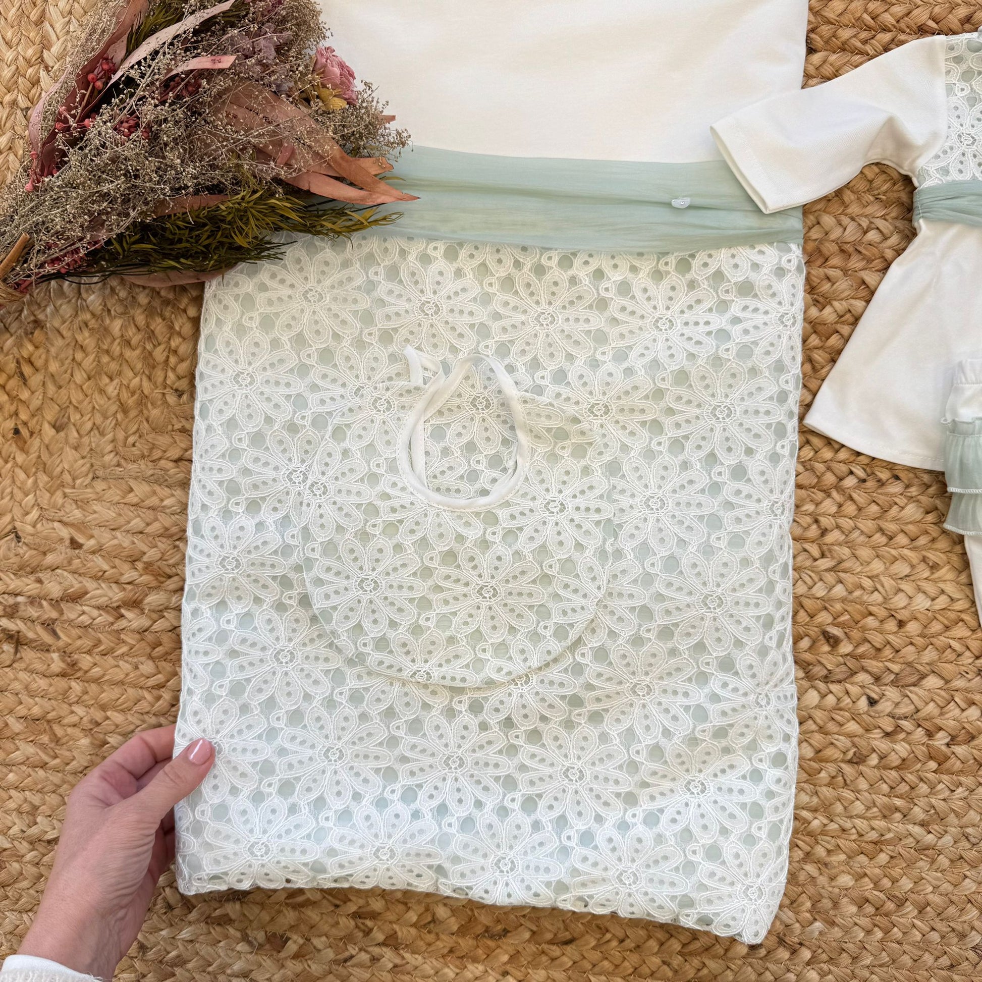 Un’uscita clinica per neonata dal gusto delicato e raffinato, pensata per chi ama l’eleganza sobria fin dal primo giorno. La tutina in 100% cotone accarezza la pelle con morbidezza, mentre la copertina in cotone e poliestere è impreziosita da lavorazione in macramè e dettagli verde salvia. Un set nascita armonioso, curato in ogni particolare.