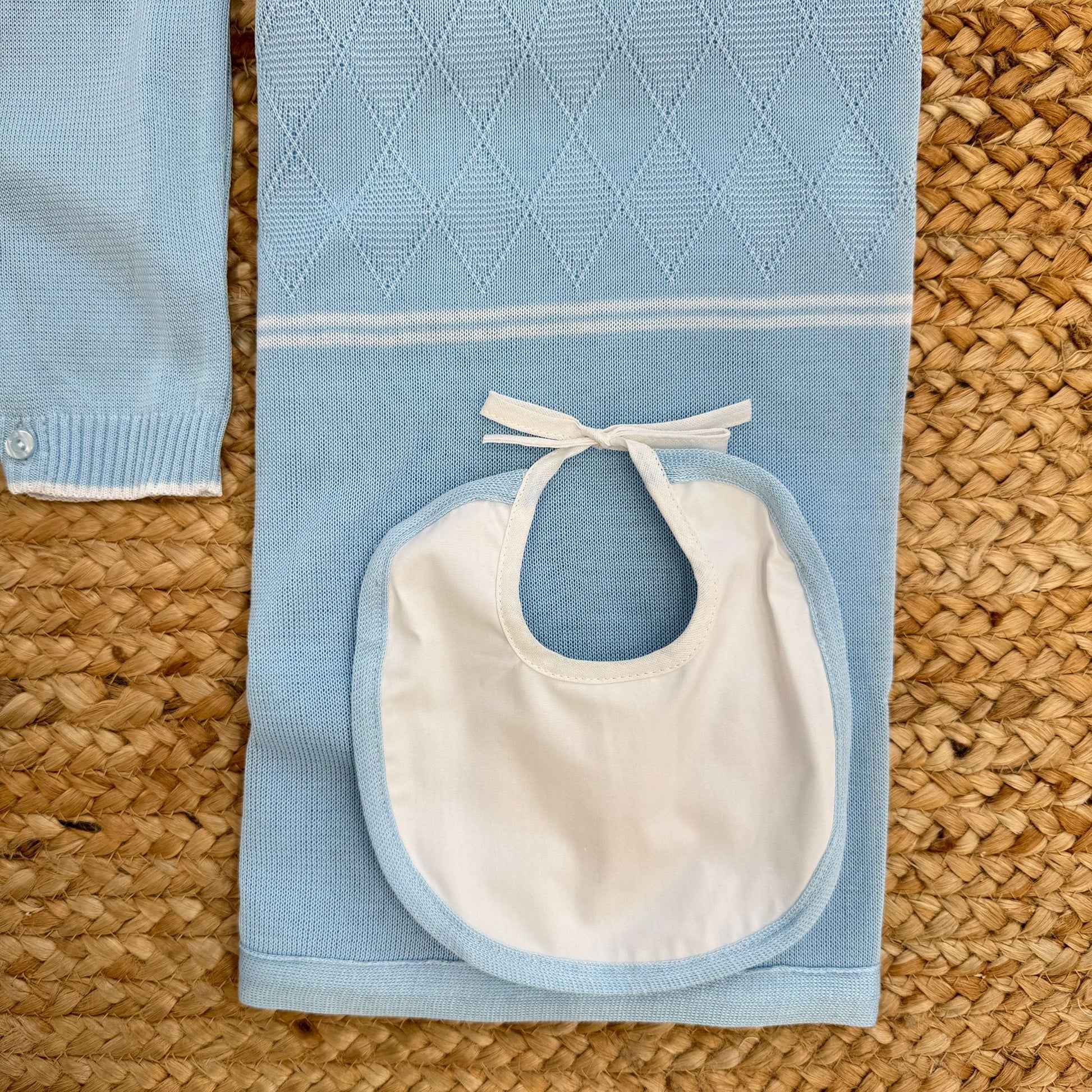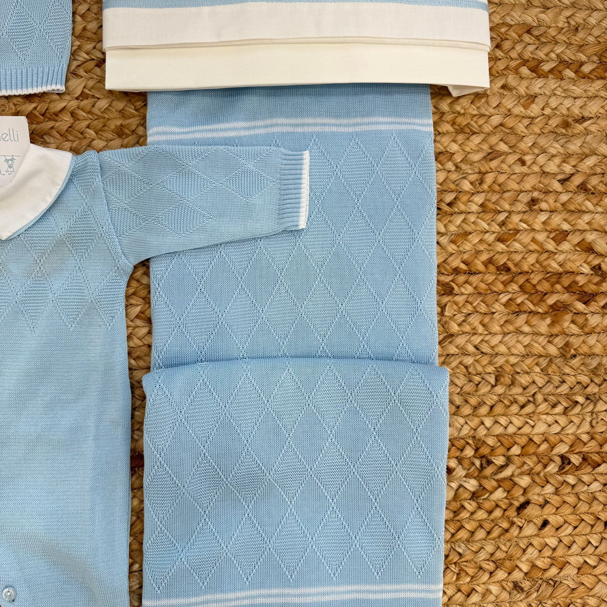 Uscita clinica completa in 100% cotone azzurro per neonato composta da tutina intera con colletto bianco, copertina lavorata a rombi, cappellino coordinato, bavetta, scarpette e set lenzuola con bordo azzurro. Un coordinato nascita morbido, traspirante e delicato sulla pelle, ideale per ospedale e primi giorni a casa.