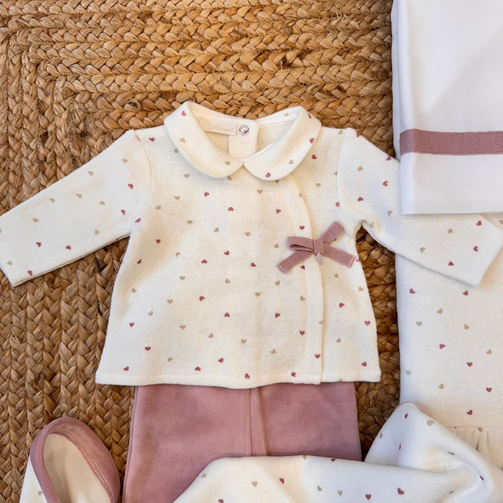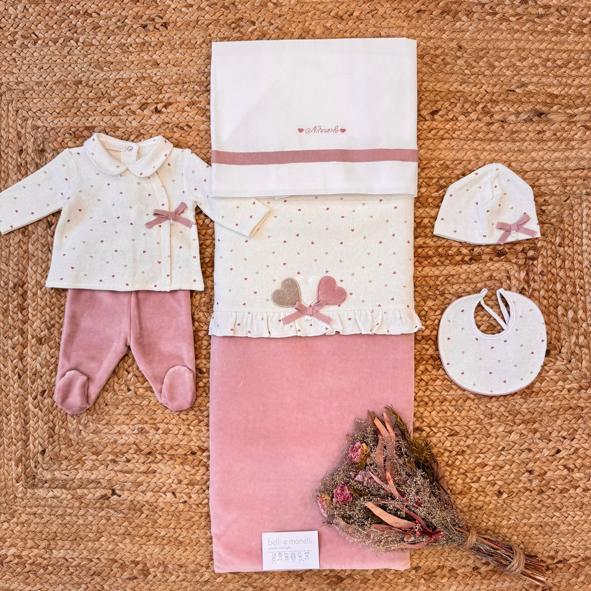 Un'uscita clinica raffinata e romantica, pensata per le mamme che desiderano il massimo del comfort e dell'eleganza per la loro bambina.