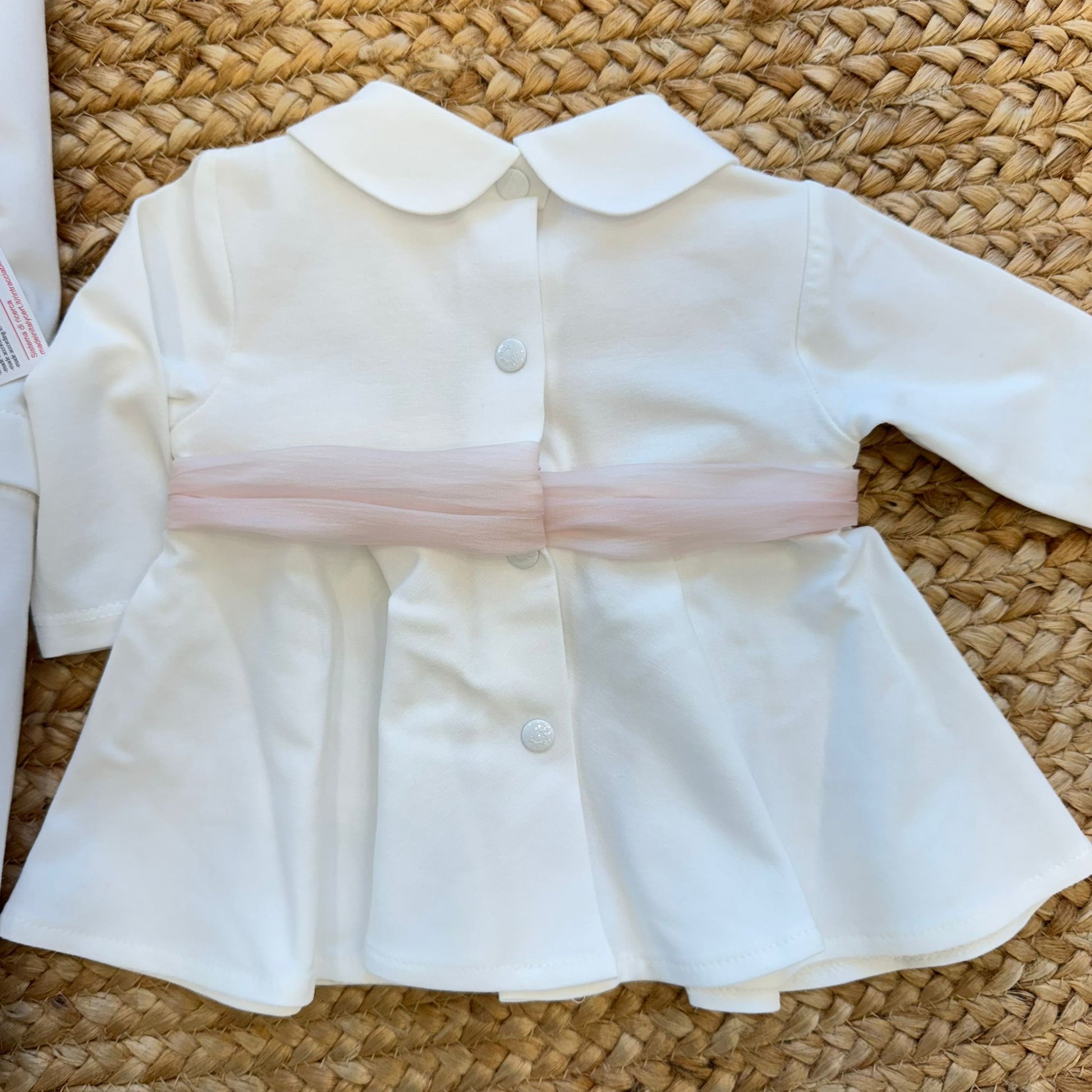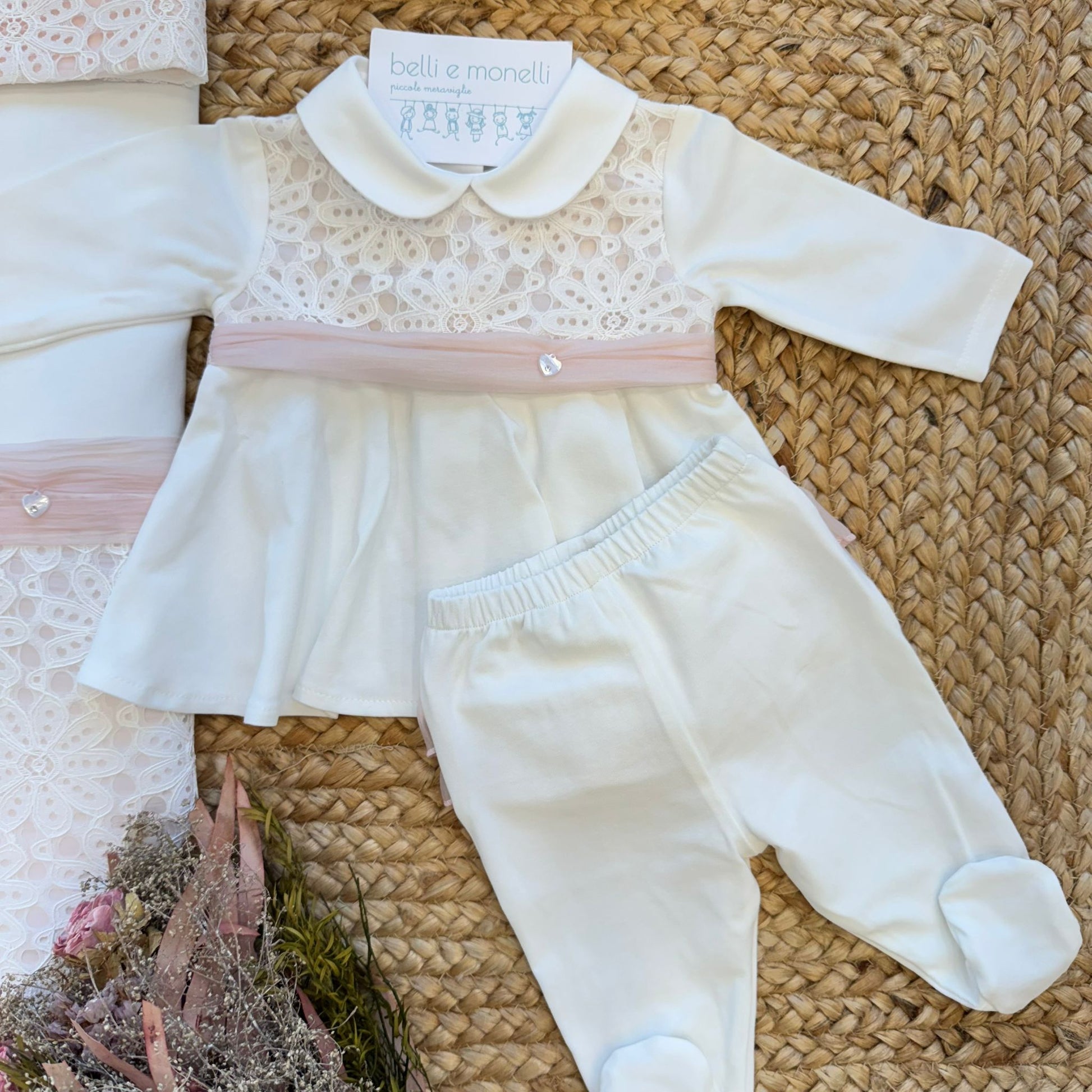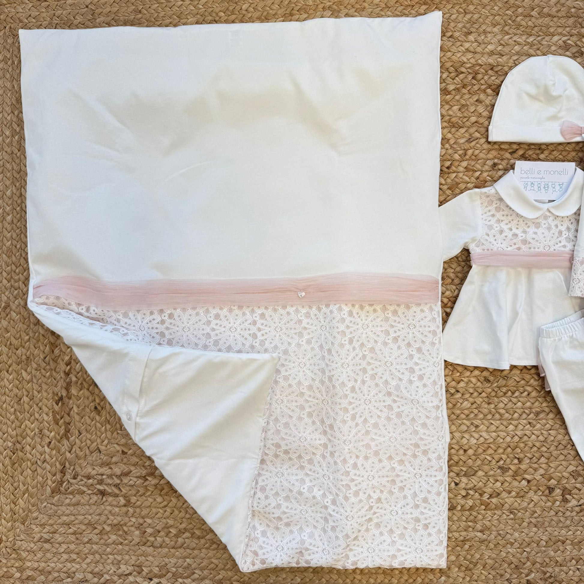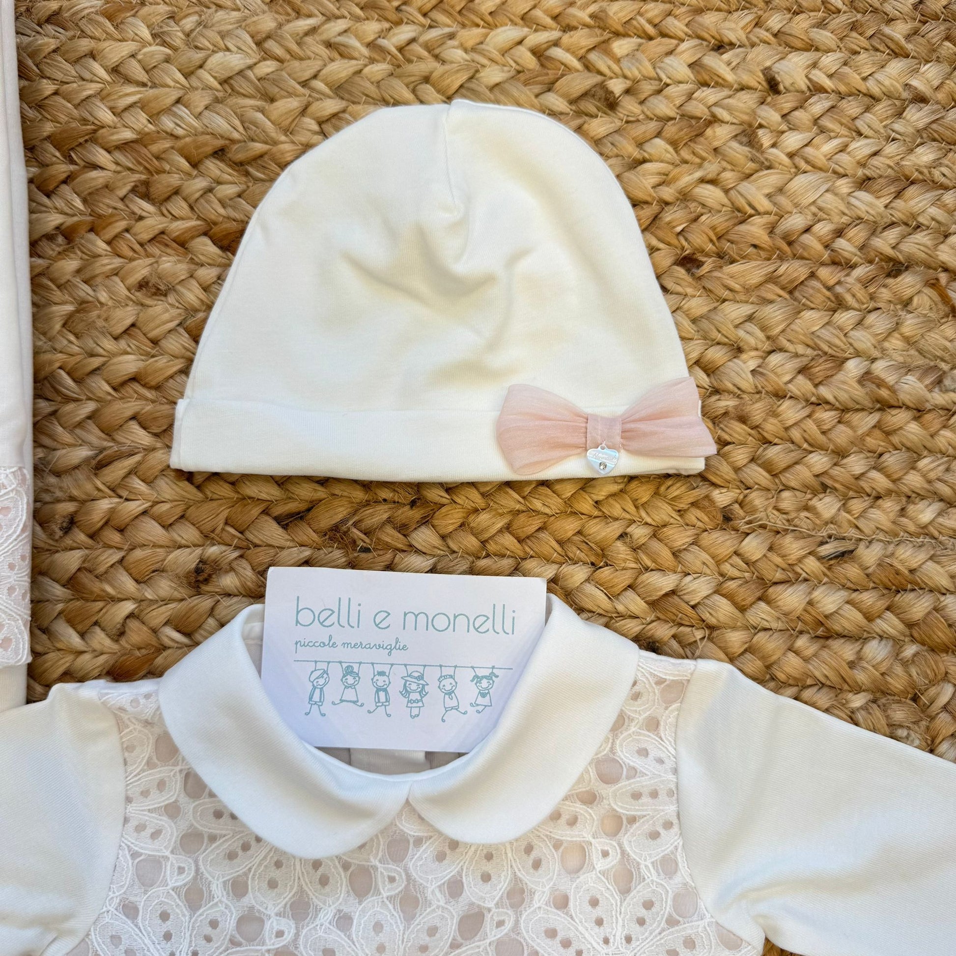 Un’uscita clinica per neonata dal gusto romantico e raffinato, pensata per chi ama i dettagli delicati. La tutina in 100% cotone è impreziosita da inserti in macrame' e fascia rosa cipria, abbinata a copertina sfoderabile con imbottitura inclusa, cappellino coordinato e biancheria letto in cotone. Un set nascita elegante, ideale come uscita clinica speciale.