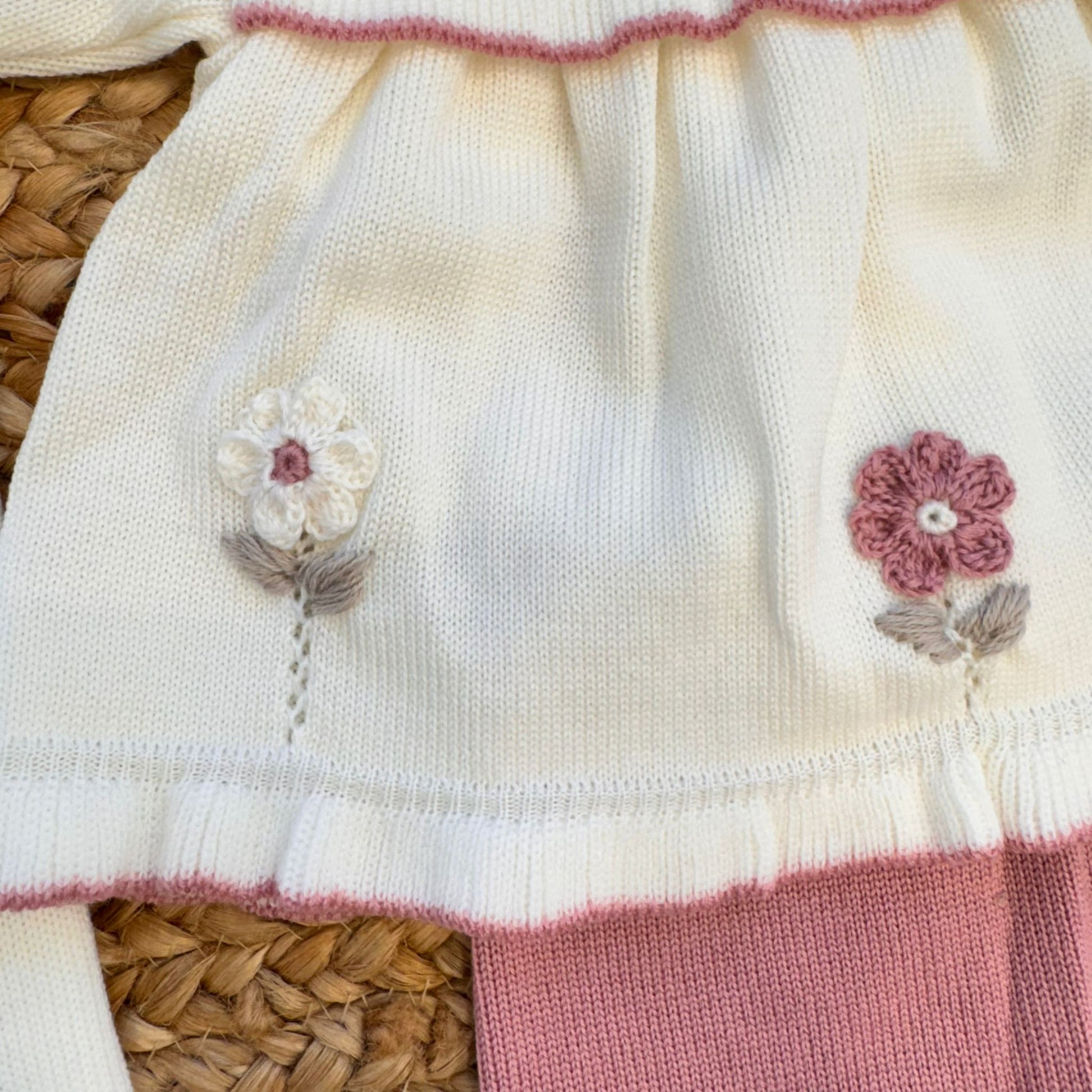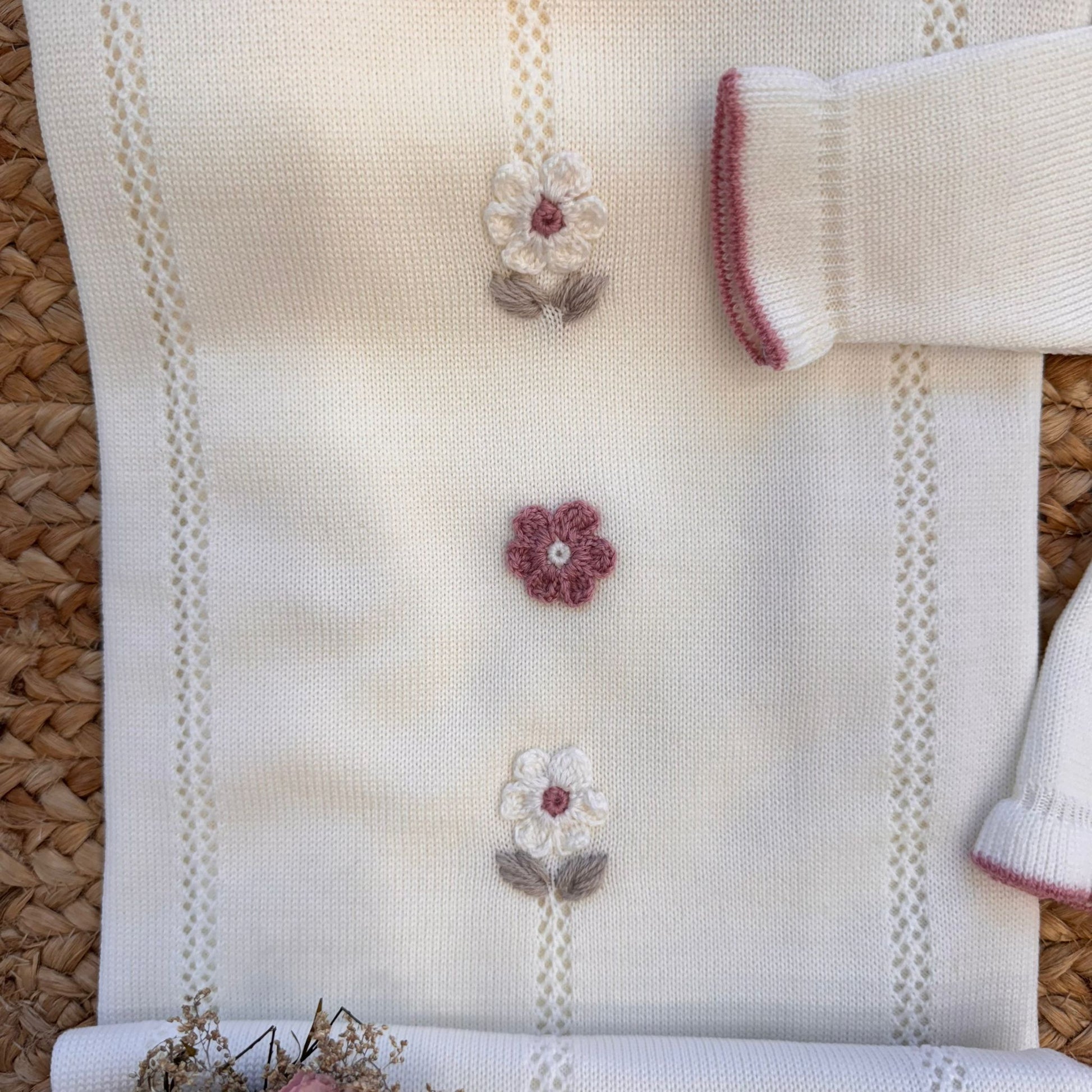 Delicato coordinato per neonata realizzato in 100% pura lana, pensato per il momento più speciale: l’uscita dalla clinica. Questo set nascita include copertina, coprifasce, pantalone, cappellino e scarpette, tutti perfettamente abbinati in ogni dettaglio.Il coprifasce, dalla linea a tunica, è decorato con raffinati fiori ricamati a mano in rilievo, nei toni panna, cipria e tortora. La lavorazione a punto traforato valorizza la qualità artigianale del capo, mentre il bordo con smerlo rosa cipria aggiunge un tocco elegante e femminile. Il pantalone rosa antico, morbido e confortevole, si abbina alle scarpette panna con fiore coordinato applicato. Il cappellino completa il coordinato con lo stesso ricamo floreale ripetuto e rifinito con smerlature panna e cipria.La copertina, anch’essa in pura lana, presenta una lavorazione a traforo verticale e una bordatura a volant con doppio tono panna e cipria, oltre a fiori tridimensionali ricamati con cura e armonia, posizionati con equilibrio su tutta la superficie.Questo coordinato è perfetto come set nascita di pregio, ideale anche come regalo per neomamme attente alla qualità dei filati e all’estetica sartoriale dei primi completini.