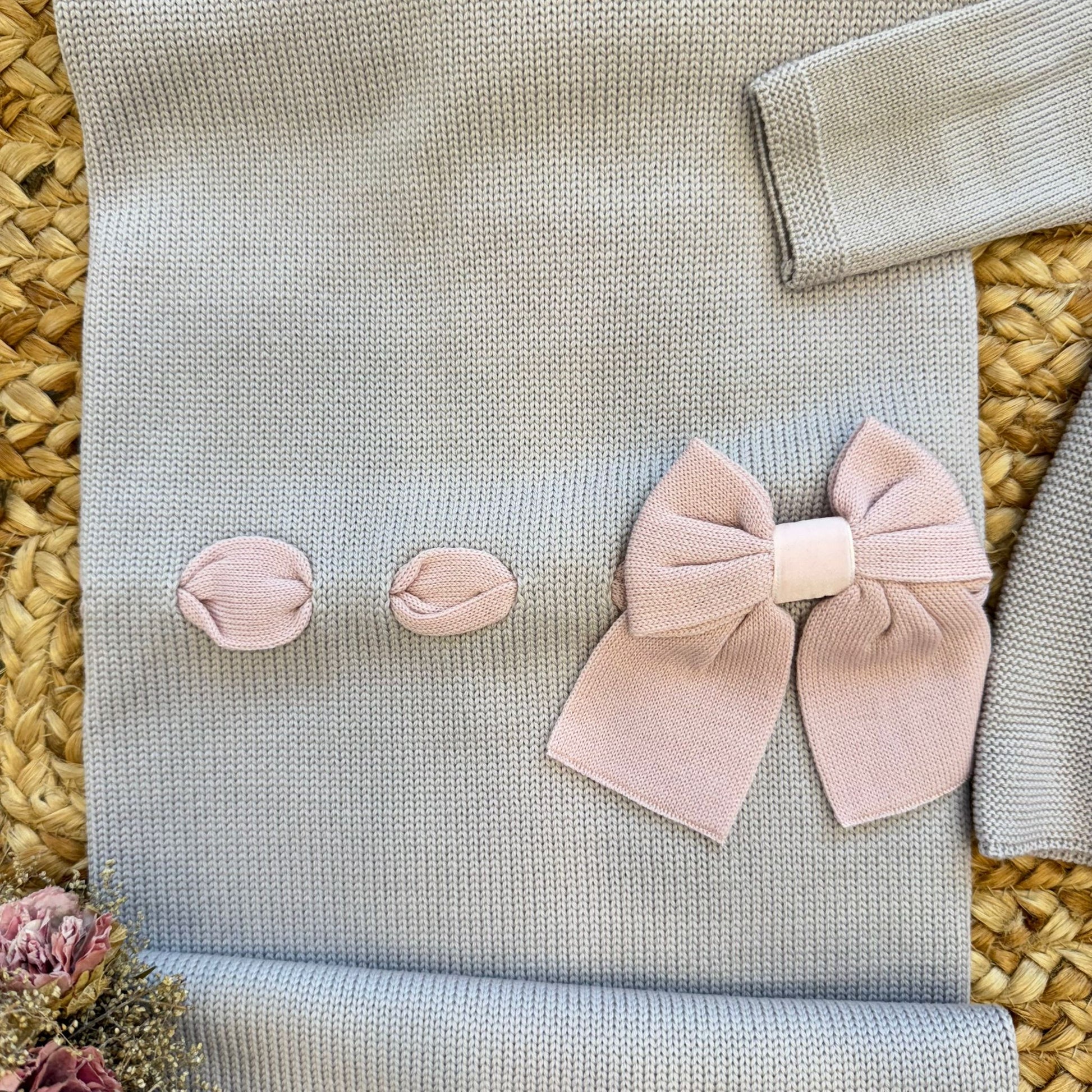 Raffinata uscita clinica per neonata in 100% pura lana, composta da abito con colletto e maxi fiocco rosa, pantalone coordinato, copertina, cappellino e scarpine con fiocco. Il tono grigio perla si unisce al rosa cipria per un corredino elegante e di pregio, perfetto come set nascita e prima uscita. Che ci crediate o no, i vostri bambini cambieranno il mondo.