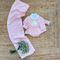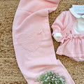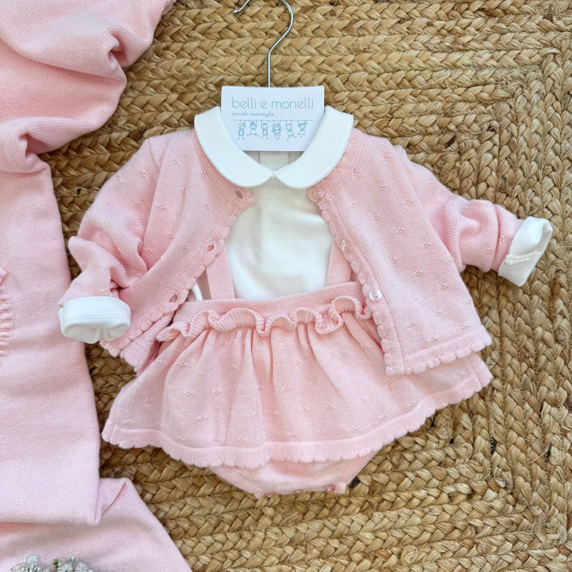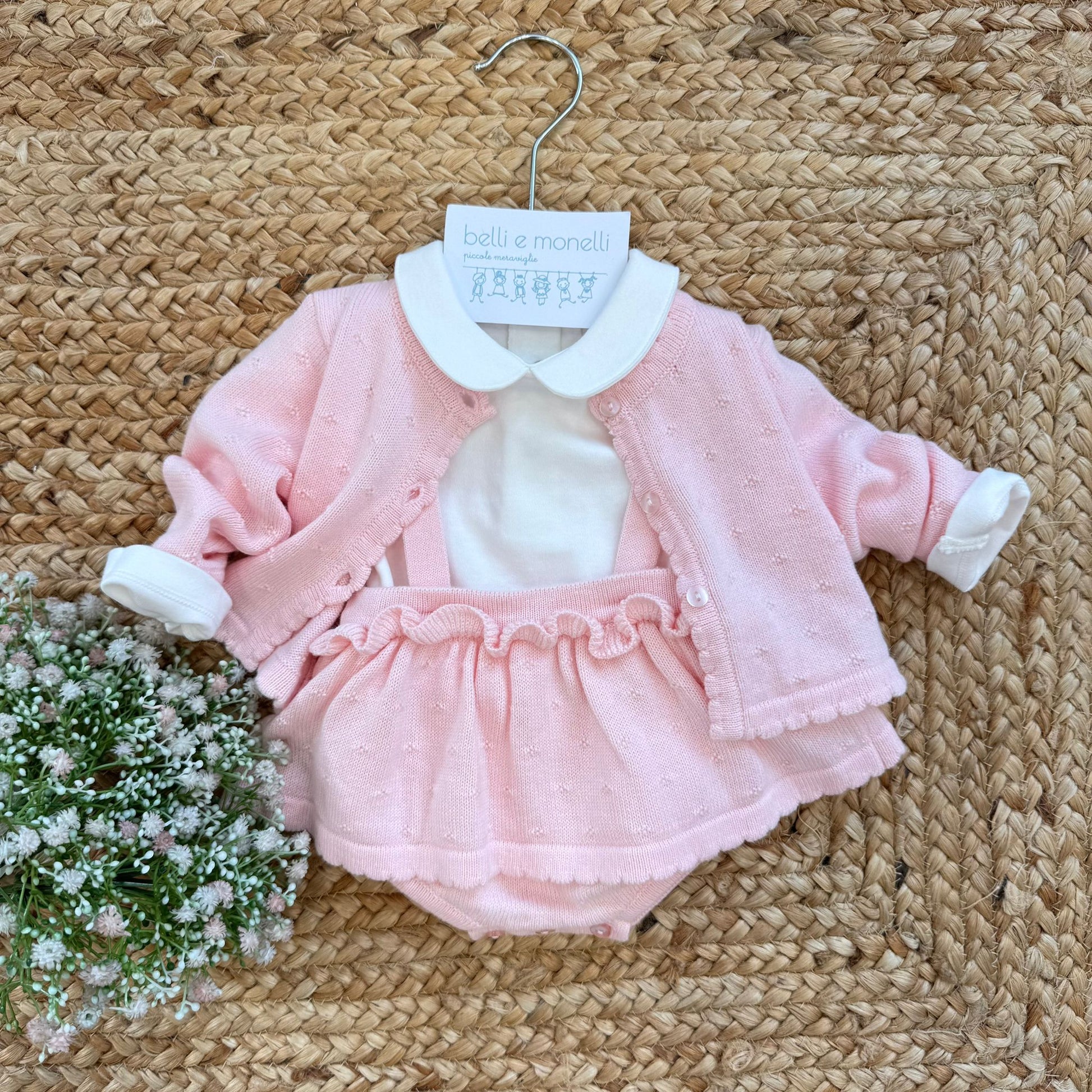 Elegante set uscita clinica per neonata in caldo cotone rosa, composto da cardigan con colletto bianco, body, gonnellina con culotte, copertina con cuore lavorato a maglia. Un corredino raffinato e confortevole, ideale come set nascita e per le prime cerimonie della tua bimba.