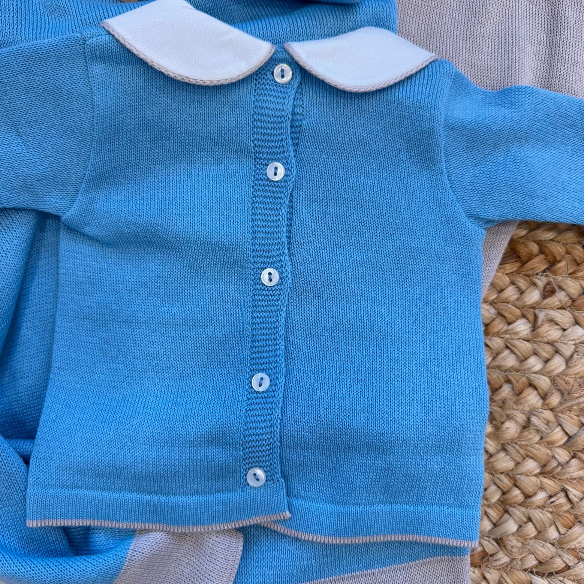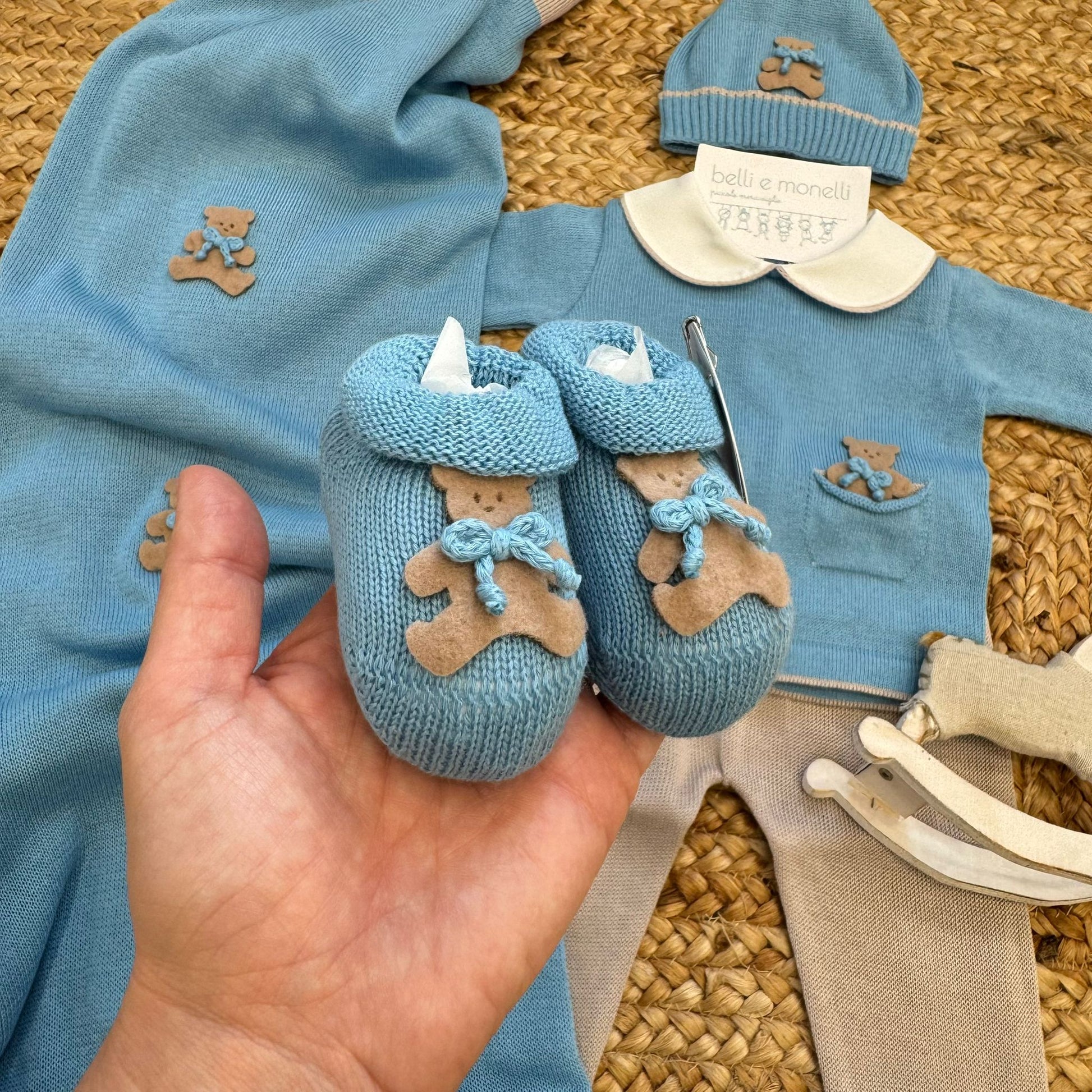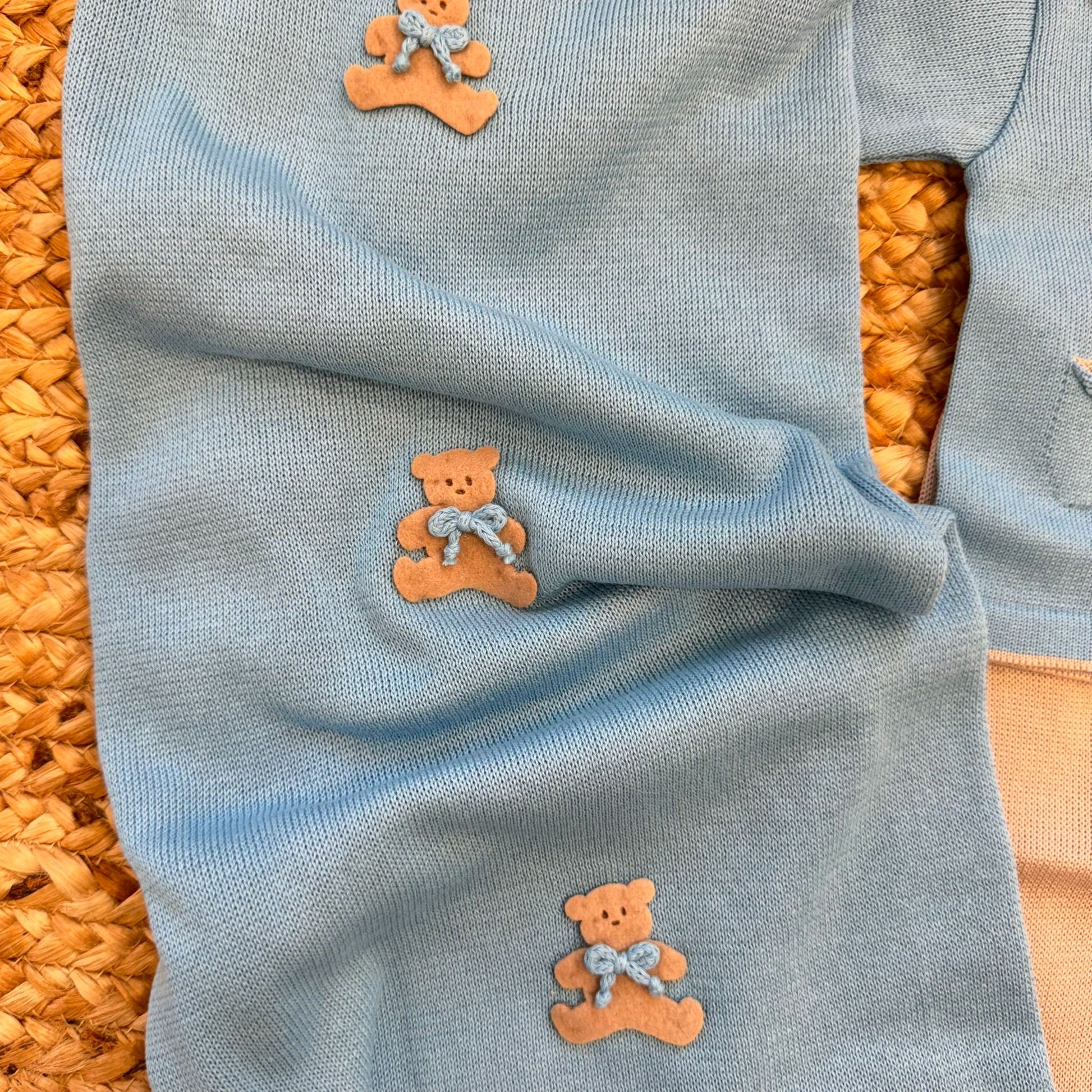Un’uscita clinica dolce e rassicurante, perfetta per il primo corredino del neonato. Il set è realizzato in 100% filo di cotone ed è impreziosito da applicazioni di orsetti tono sabbia, presenti sulla copertina, sulla tutina, sul cappellino e sulle scarpette. La tutina è un completo due pezzi con colletto bianco e taschini decorativi, curata nei dettagli sartoriali e pensata per garantire comfort e libertà di movimento. Un coordinato che unisce tenerezza ed eleganza senza eccessi.