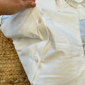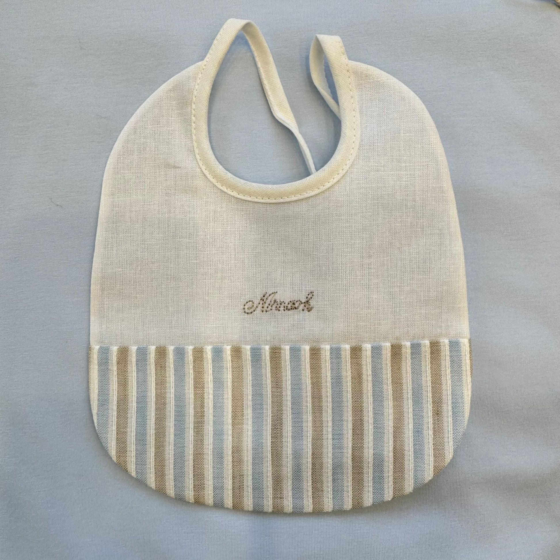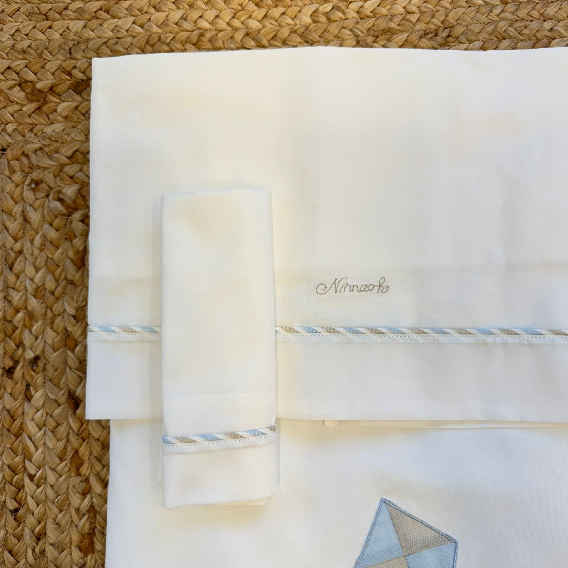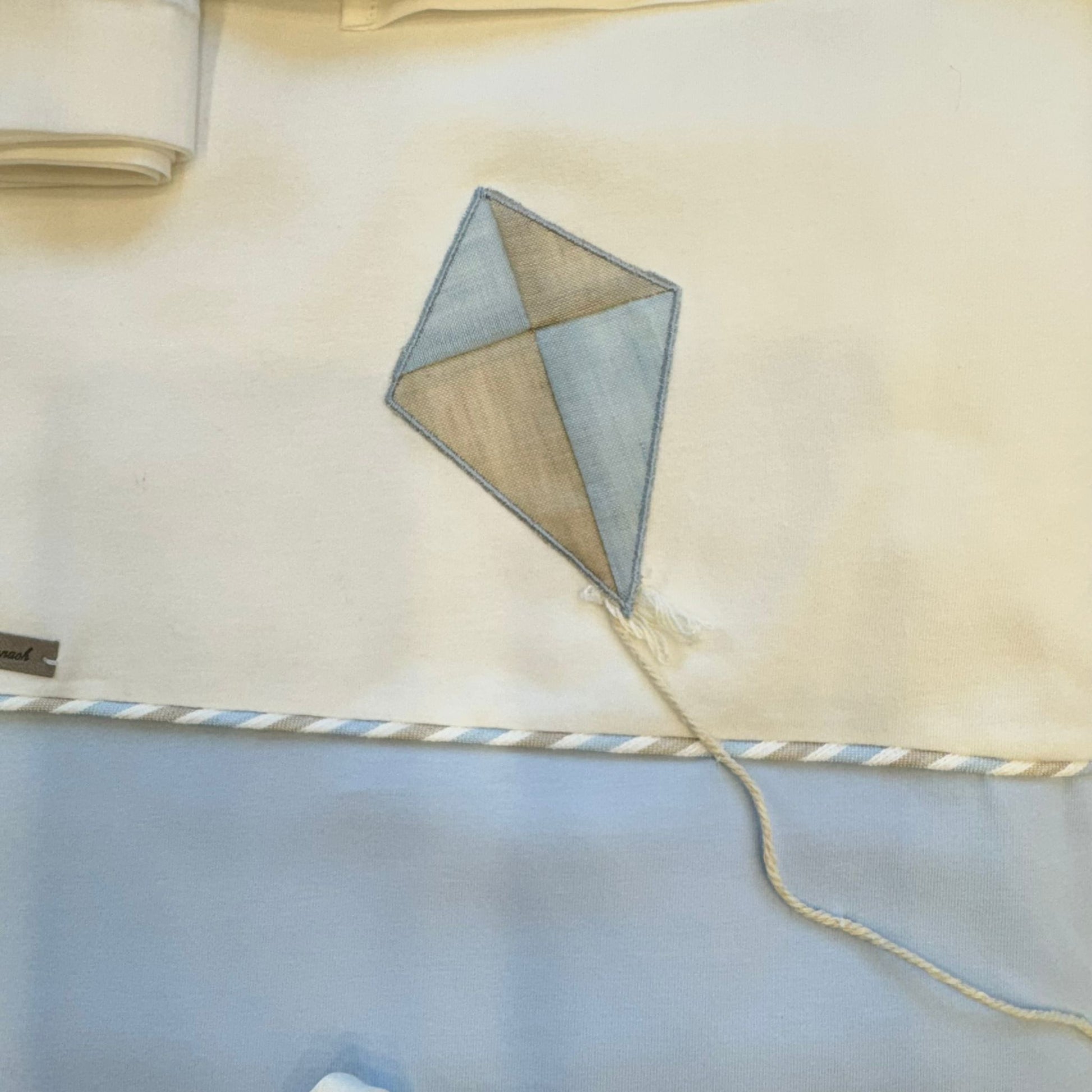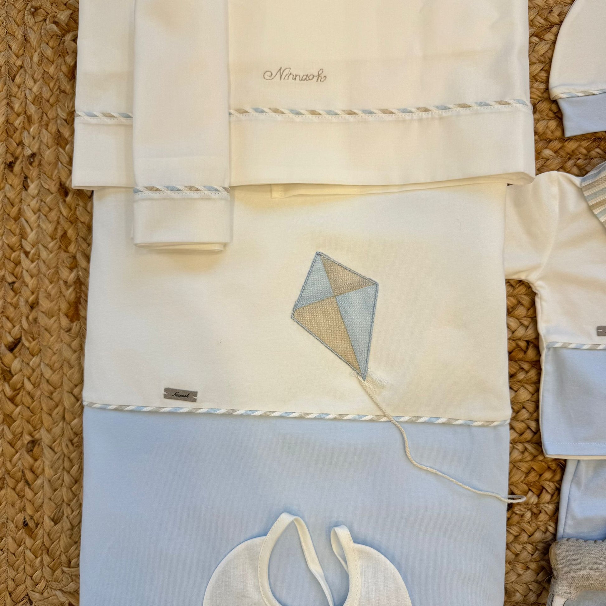 Un’uscita clinica dal gusto delicato e senza tempo, pensata per accogliere il neonato con leggerezza ed eleganza. Il coordinato comprende tutina due pezzi in cotone, cappellino coordinato, bavetta e coperta sfoderabile con imbottitura inclusa nel prezzo. L’aquilone applicato e i profili a righe nei toni azzurro e sabbia raccontano una lavorazione curata, pulita e raffinata.