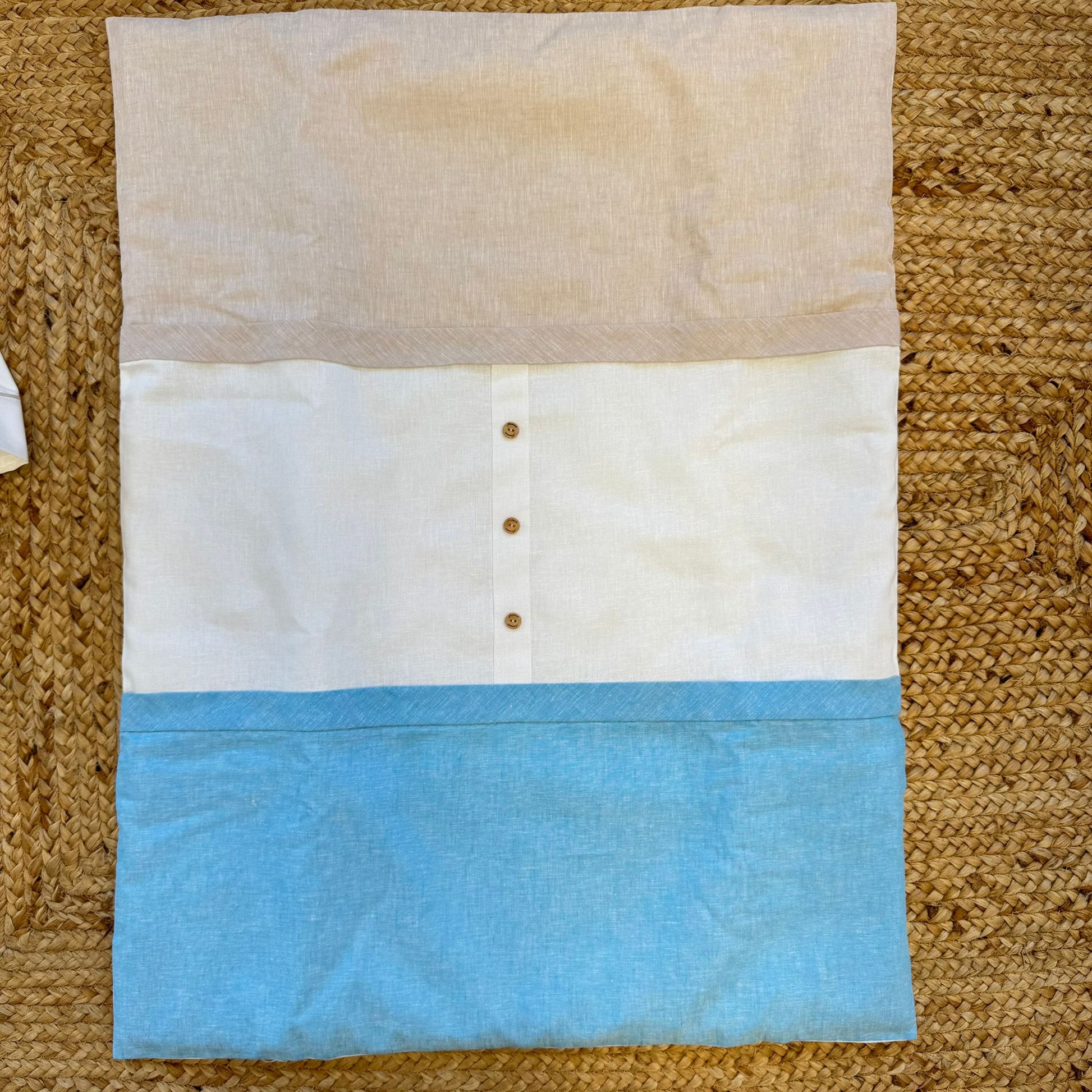 La copertina coordinata, sfoderabile con imbottitura inclusa nel prezzo, è confezionata in 50% cotone e 50% lino, per un effetto raffinato e traspirante, ideale per le prime stagioni.
