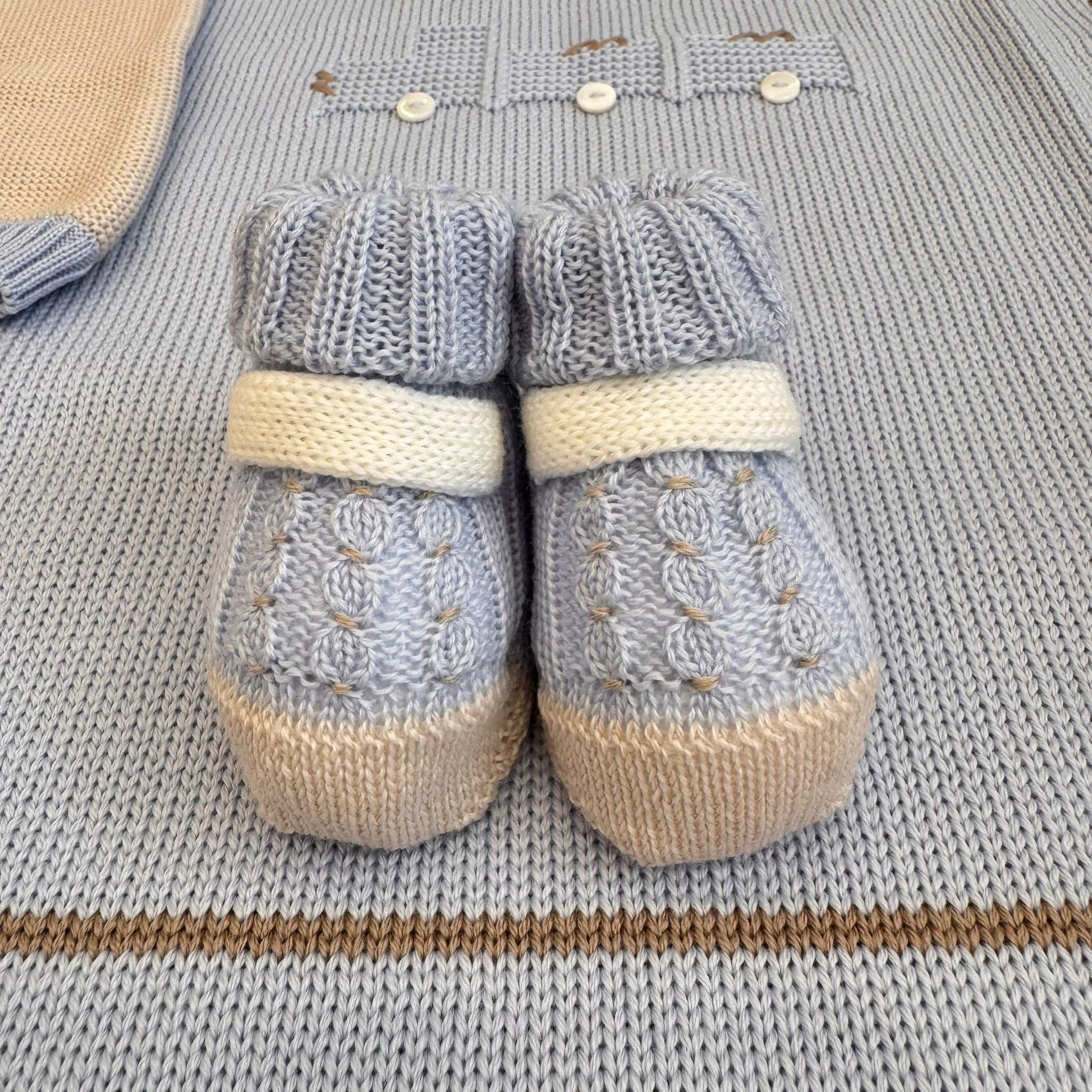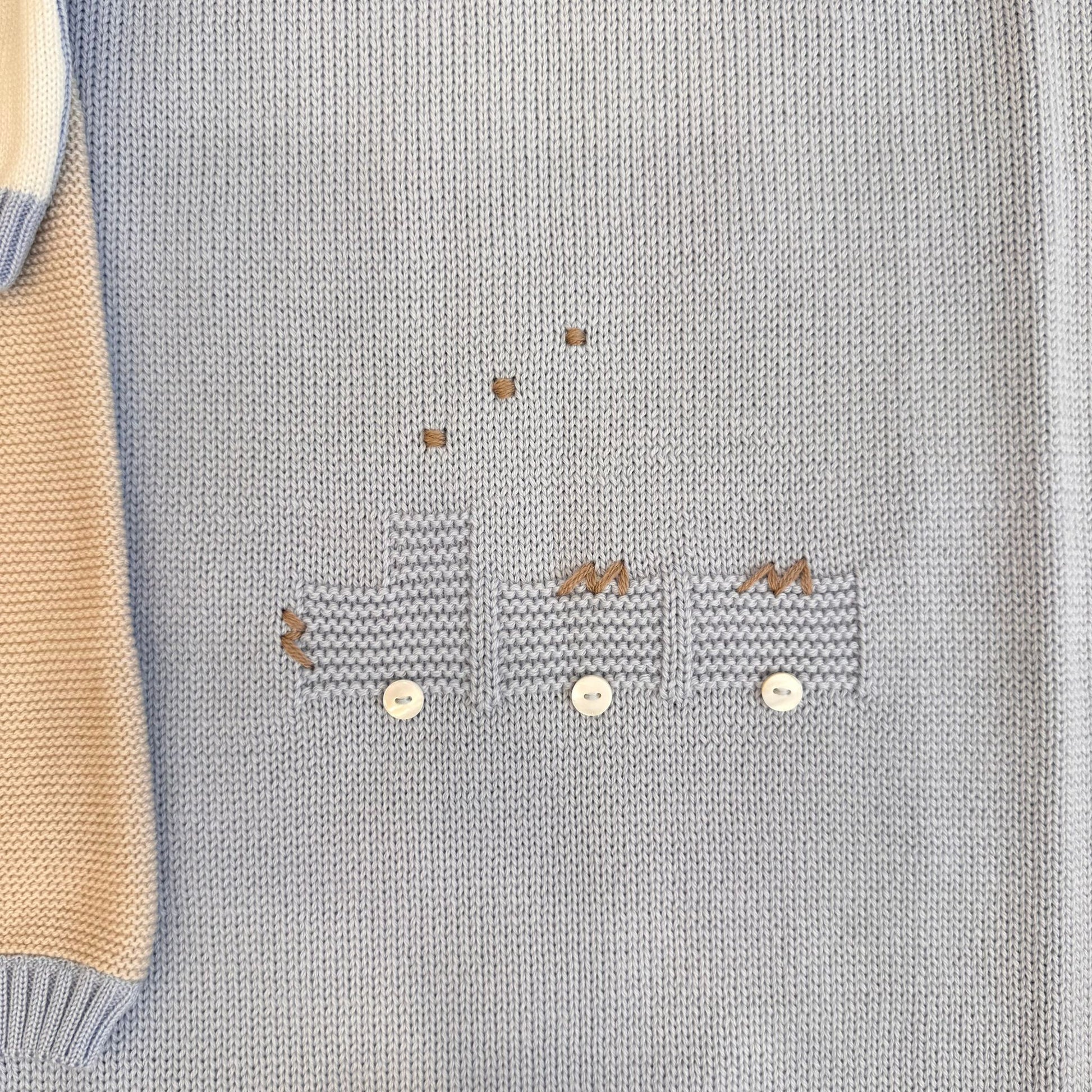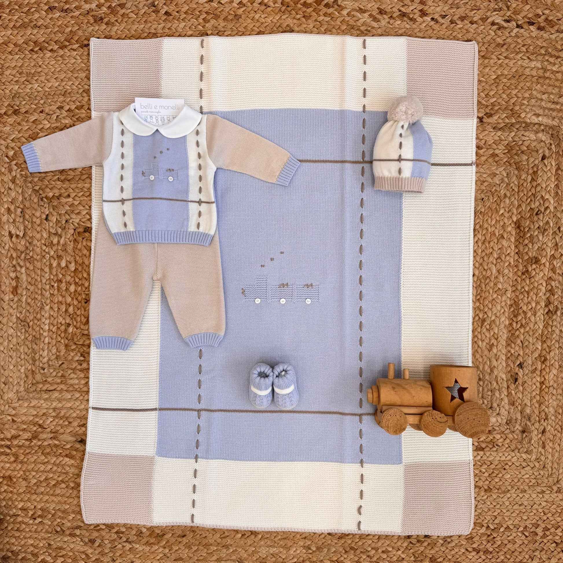 Il completino presenta un ricamo esclusivo a tema trenino, lavorato a maglia con dettagli artigianali: i vagoni sono eseguiti in rilievo con effetto punto nocciolina, mentre i fumi e le decorazioni del paesaggio sono realizzati con ricamo a mano in punto nodino e punto erba. Il cappellino è arricchito da un pompon tono su tono e da inserti a contrasto panna e azzurro polvere, perfettamente in armonia con la copertina. Le scarpette, in tinta con il completo, presentano una fascia lavorata a coste e piccoli pois decorativi ottenuti con punto nocciolina tono su tono, che richiamano il ricamo del coprifasce.