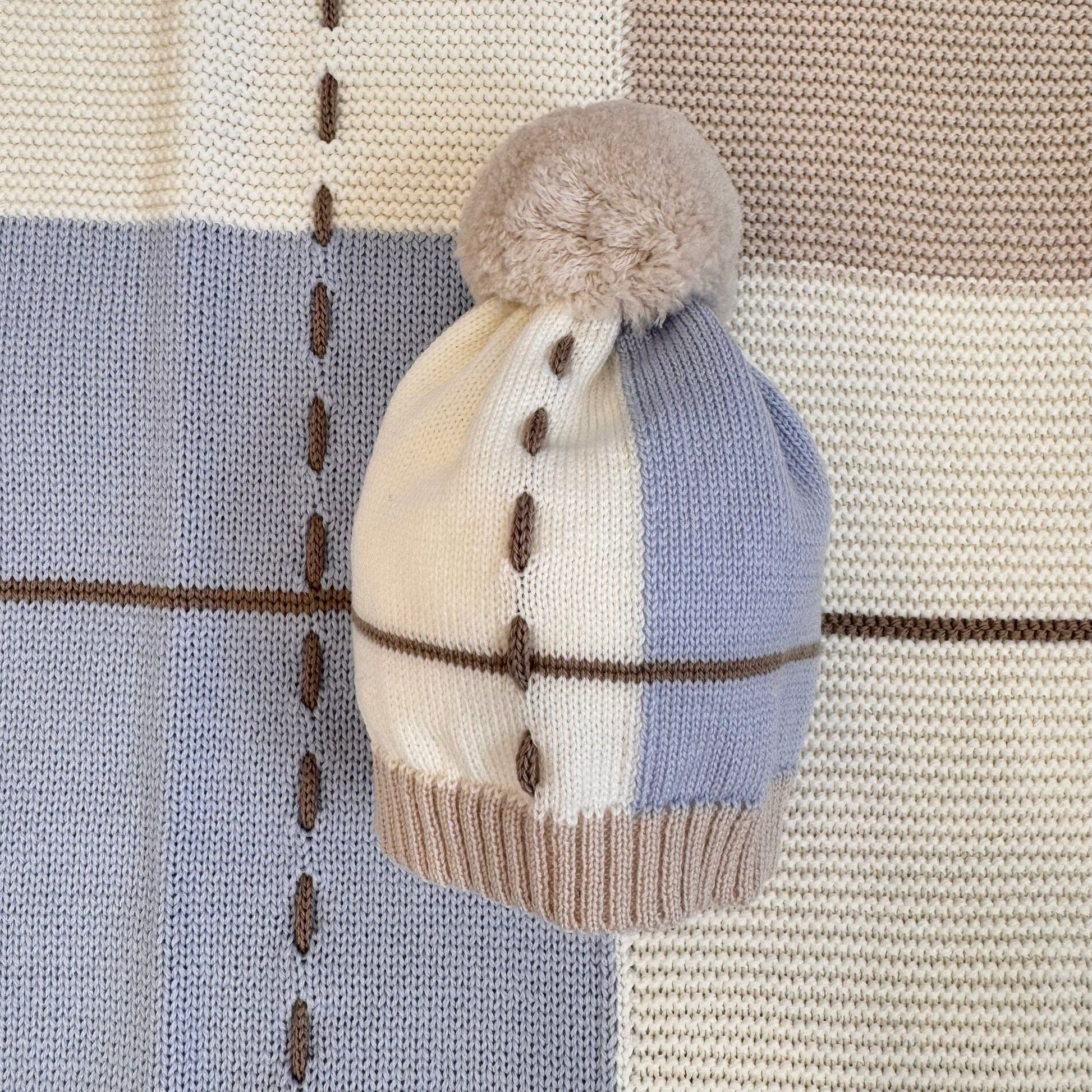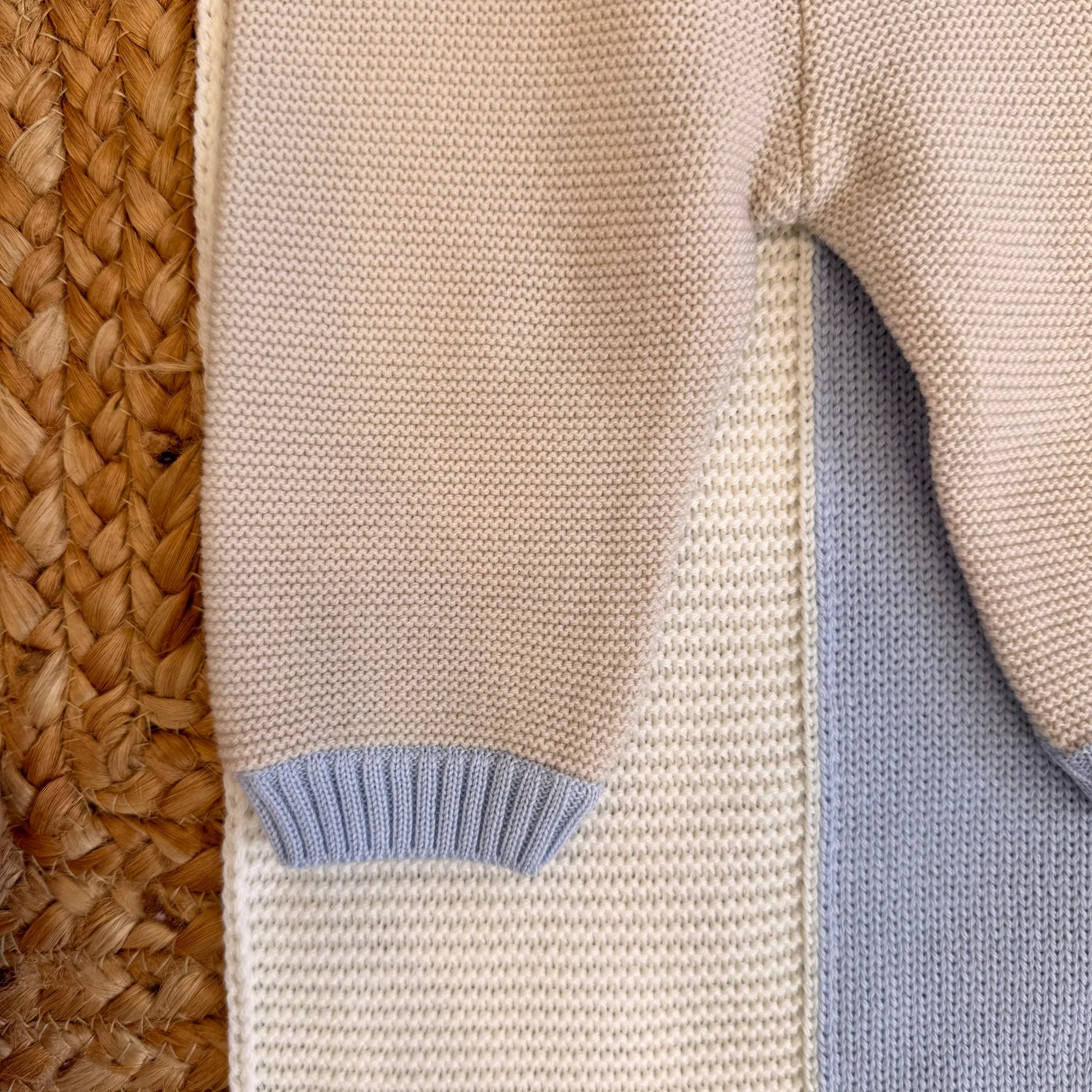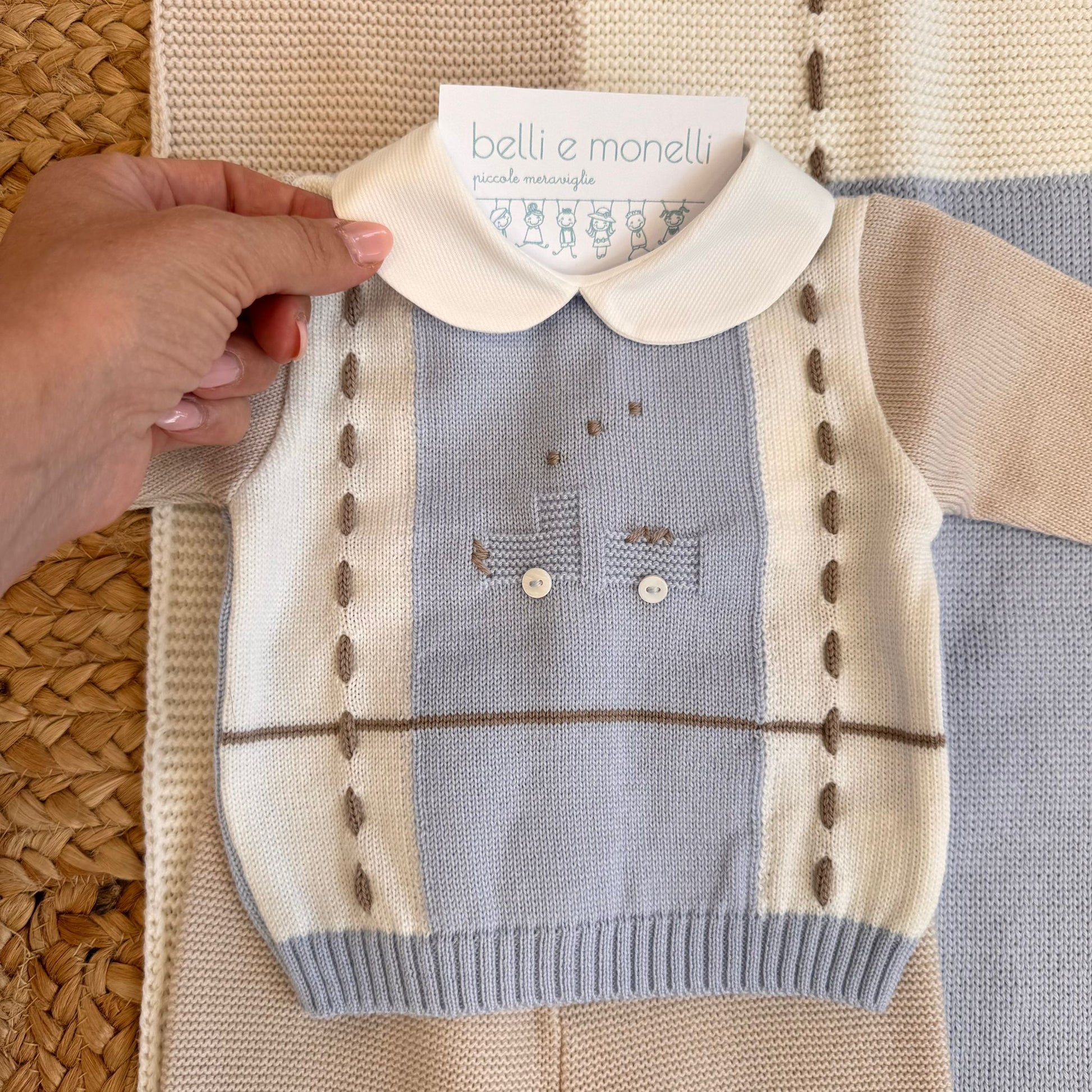 Il completino presenta un ricamo esclusivo a tema trenino, lavorato a maglia con dettagli artigianali: i vagoni sono eseguiti in rilievo con effetto punto nocciolina, mentre i fumi e le decorazioni del paesaggio sono realizzati con ricamo a mano in punto nodino e punto erba. Il cappellino è arricchito da un pompon tono su tono e da inserti a contrasto panna e azzurro polvere, perfettamente in armonia con la copertina. Le scarpette, in tinta con il completo, presentano una fascia lavorata a coste e piccoli pois decorativi ottenuti con punto nocciolina tono su tono, che richiamano il ricamo del coprifasce.