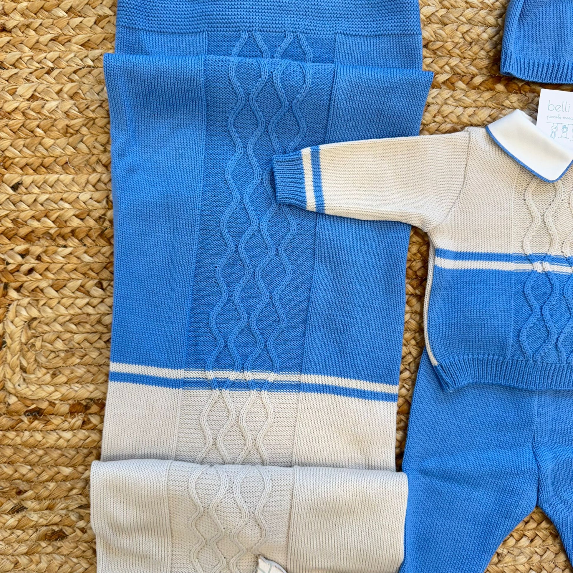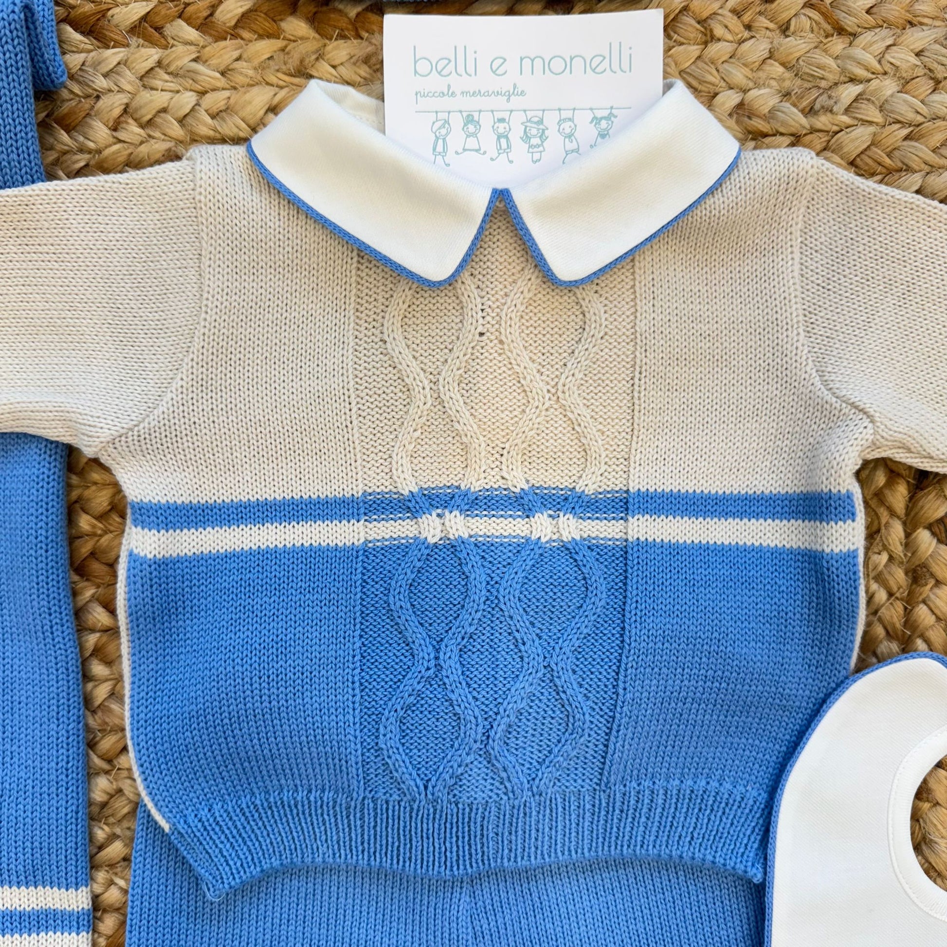 Elegante uscita clinica neonato in mista lana, composta da tutina due pezzi (maglia con colletto e pantalone), copertina coordinata, cappellino, bavetta ricamata e scarpine. Il coordinato azzurro e panna con lavorazione a intreccio trasmette pregio e dolcezza, perfetto per set nascita e primo corredino di lusso. Che ci crediate o no, i vostri bambini cambieranno il mondo.