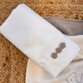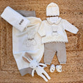 Set nascita completo per neonata in 100% pura lana, composto da copertina, tutina due pezzi, cappellino e scarpette coordinate, con dolce coniglietto ricamato a mano e fiori crochet. Include anche lenzuola sotto, sopra e federa. Una scelta raffinata per mamme che cercano qualità e calore.