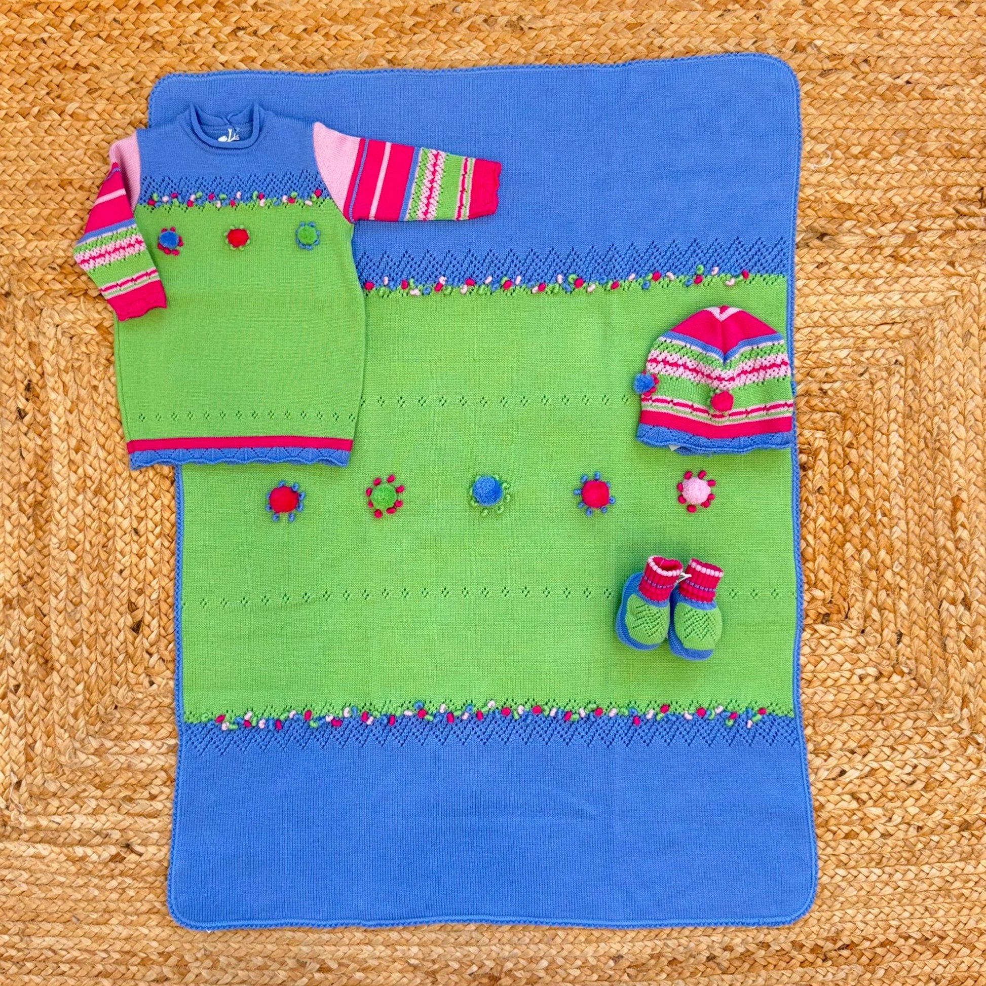 Coordinato uscita clinica in 100% pura lana, composto da tunica, copertina, cappellino e scarpette. I dettagli colorati e i pompon applicati a mano rendono questo set unico e vivace. Pensato per il corredino di neonata, ideale come set nascita di pregio. Un completo raffinato, caldo e confortevole, perfetto per le prime coccole.