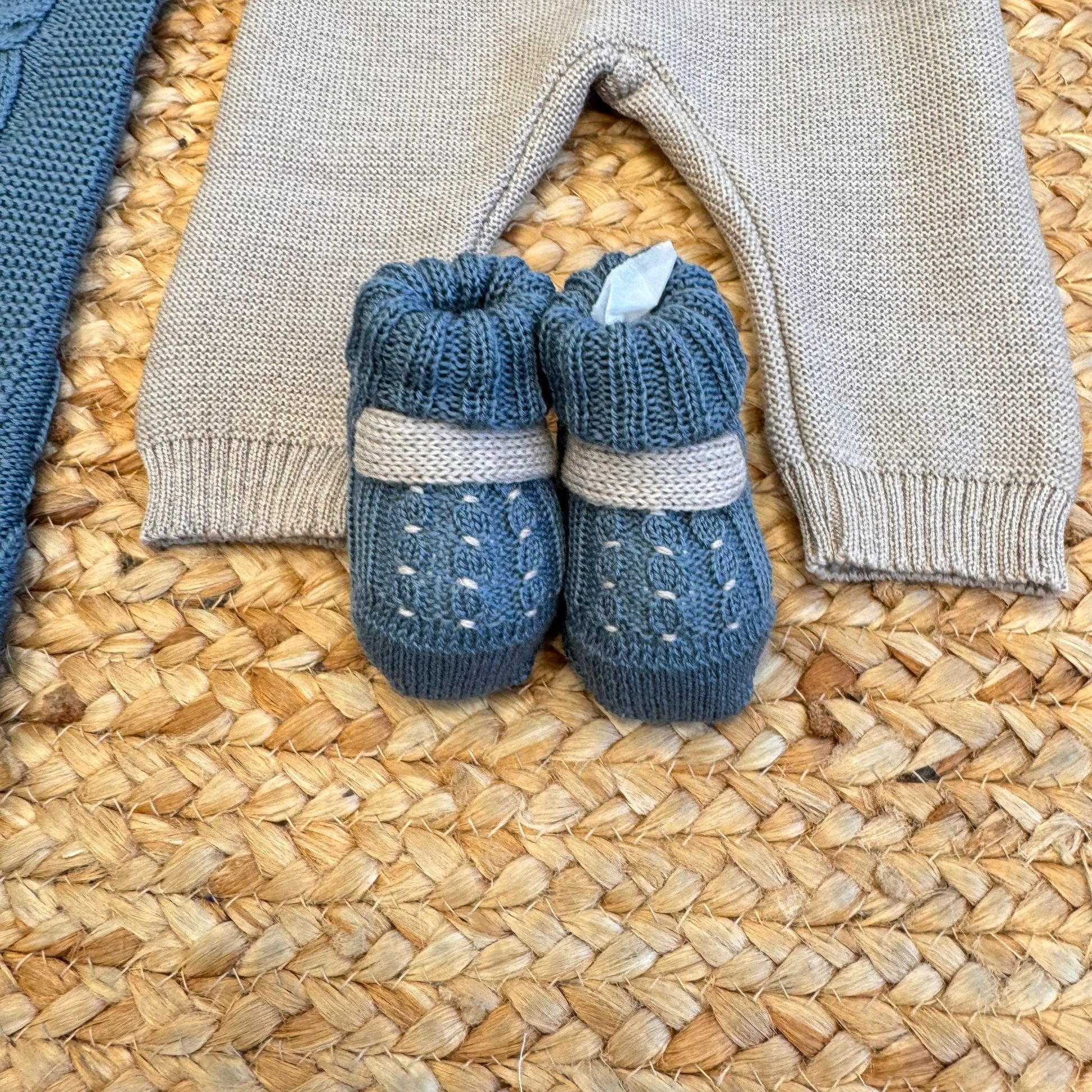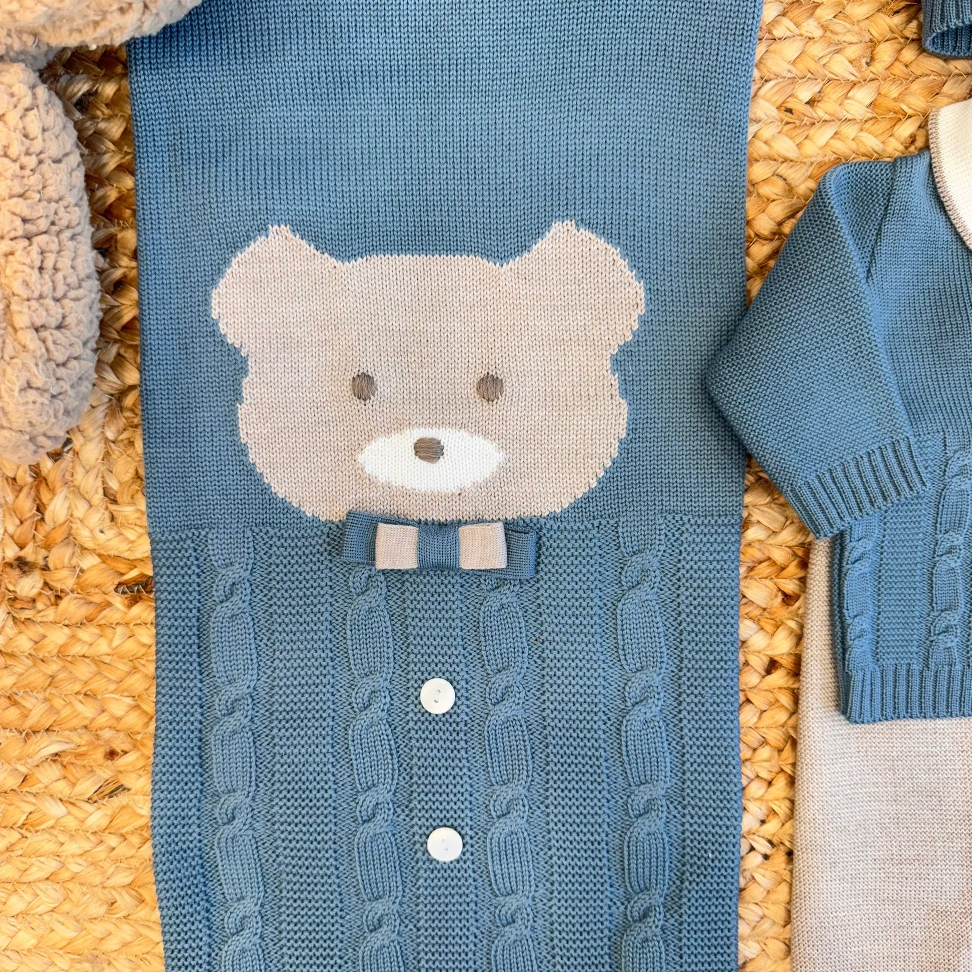 Coordinato completo per neonato in pregiata 100% pura lana, pensato per l’uscita clinica e perfetto come set nascita. Il set è composto da tutina due pezzi (maglia e pantalone), cappellino, scarpette e copertina abbinata.La maglia in verde ottanio è decorata da un simpatico orsetto centrale e lavorazione treccia, con colletto bianco e fiocchetto sabbia applicato. Il pantalone è in tinta sabbia chiara, a contrasto. Il cappellino con pompon riprende il motivo dell’orsetto, mentre le scarpine a calzino sono rifinite con un delicato bordo sabbia e lavorazione traforata. La copertina, in verde ottanio, completa il coordinato con lo stesso orsetto ricamato e fiocco decorativo.Una proposta di alta gamma, dal gusto tenero e raffinato, pensata per le mamme che desiderano un corredino esclusivo e di qualità sartoriale per i primi giorni del loro piccolo.