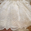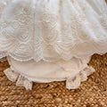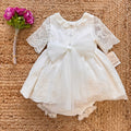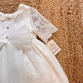 Abito battesimo bimba in tulle leggero con ricami preziosi. Colletto smerlato, maniche in pizzo trasparente e fiocco con fiore sul davanti. Maxi fiocco sul retro e culotte in cotone con balza in pizzo. Raffinato, romantico, leggero come una carezza.